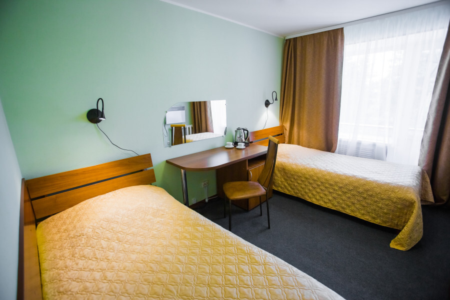 В номере имеется: 2 односпальные кровати, рабочий стол, холодильник, wi-fi, фен, чайник, посуда.