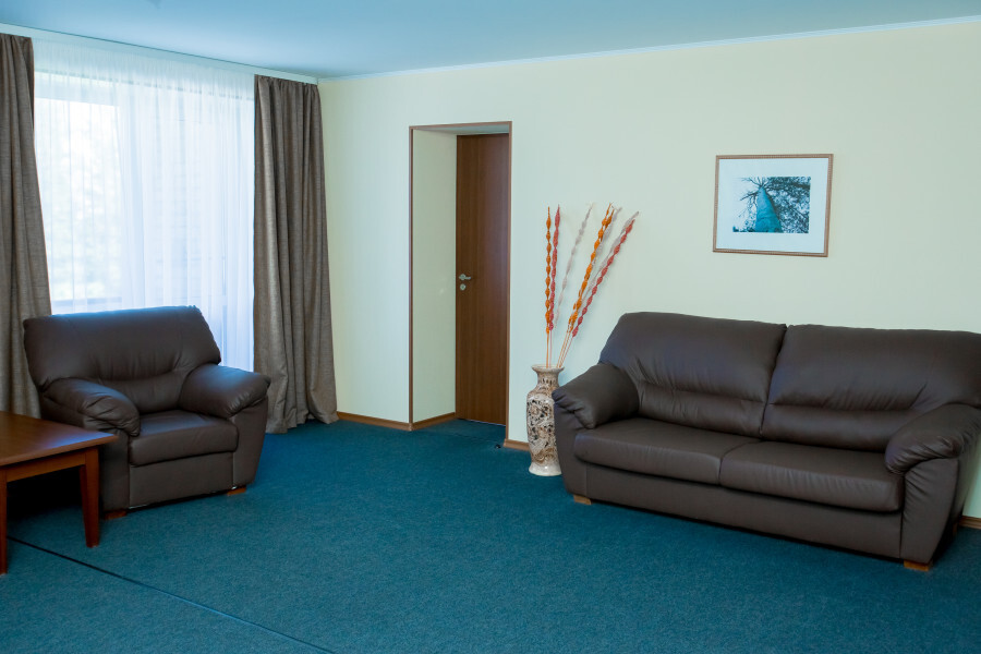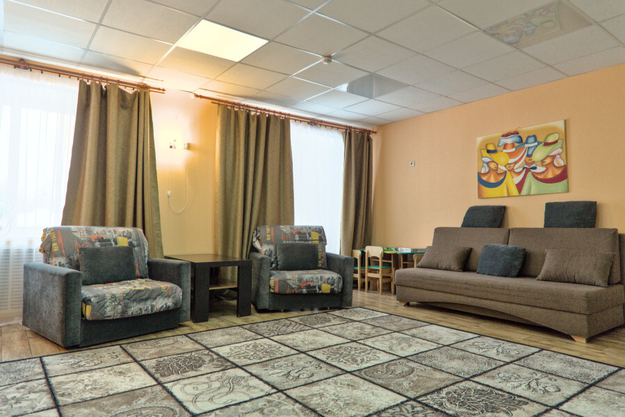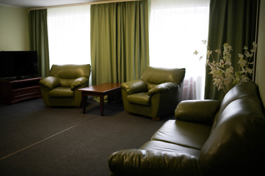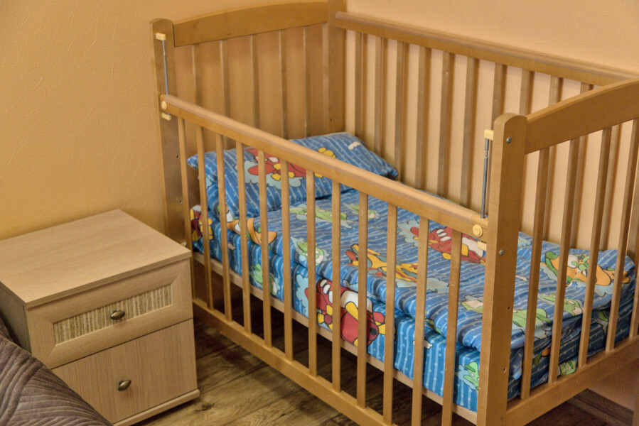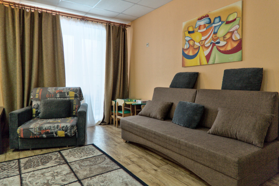 В номере имеется: мягкая мебель (кресло-кровать 2 штуки, раскладной двуспальный спальный диван), детская кроватка, детский уголок, холодильник, ТВ, WI-FI, электрический чайник, набор посуды, фен.