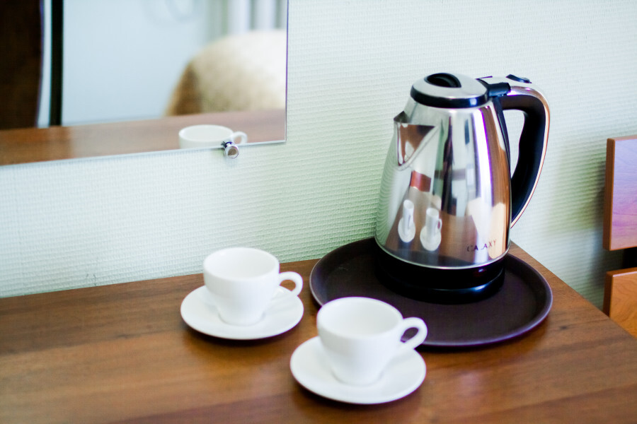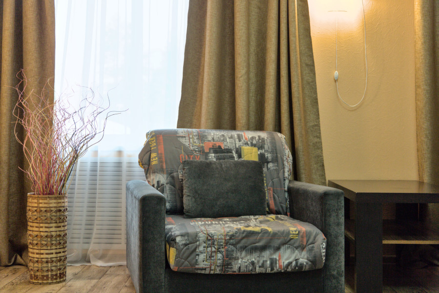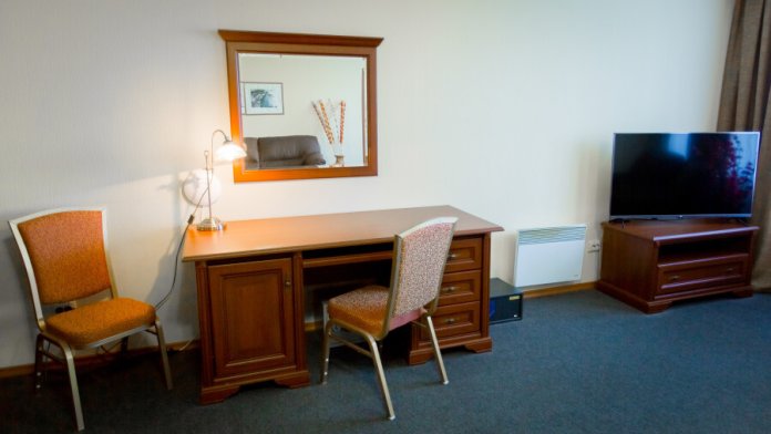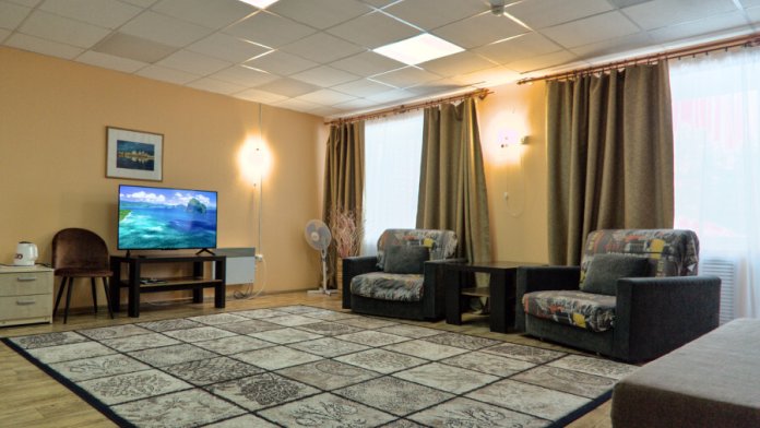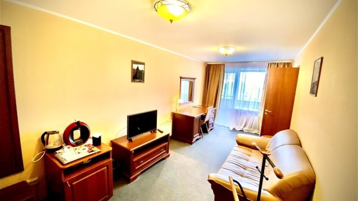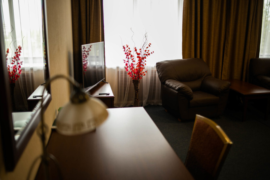 В номере имеется: мягкая мебель (раскладной 2-спальный диван), рабочий письменный стол, холодильник, ТВ, WI-FI, кофеварка, электрический чайник, набор посуды, фен.