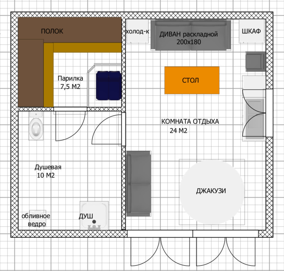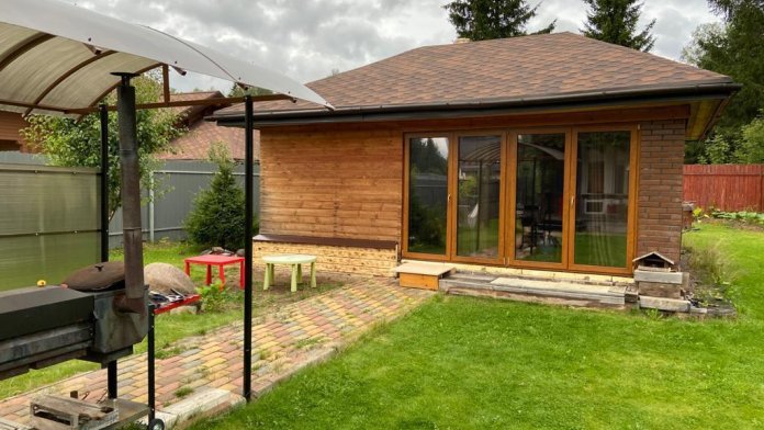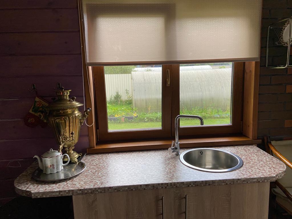 В домике теплые полы, имеется комфортный раскладной диван (размер спального места 180х200), спальные места для двух человек, телевизор, постельные принадлежности, холодильник, микроволновая печь, плита, сковородки, посуда, шампуры, шезлонги.