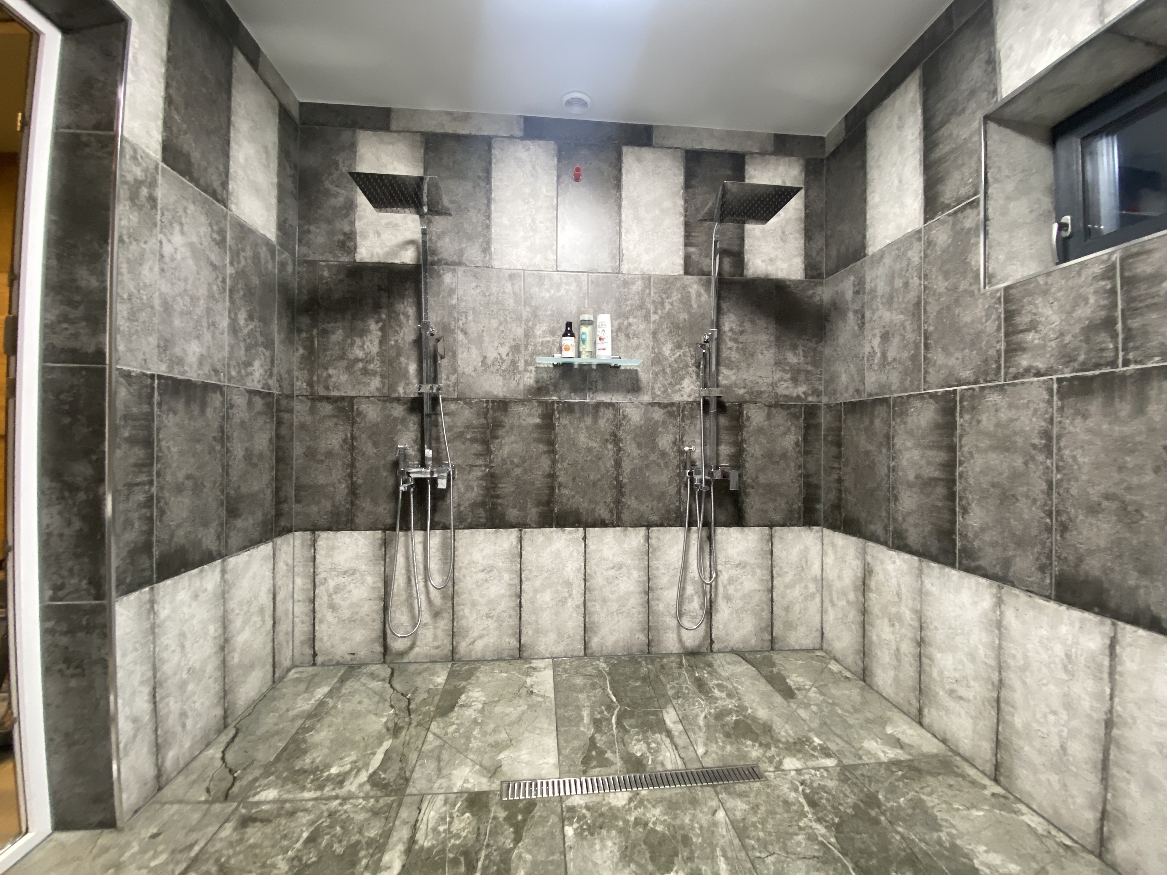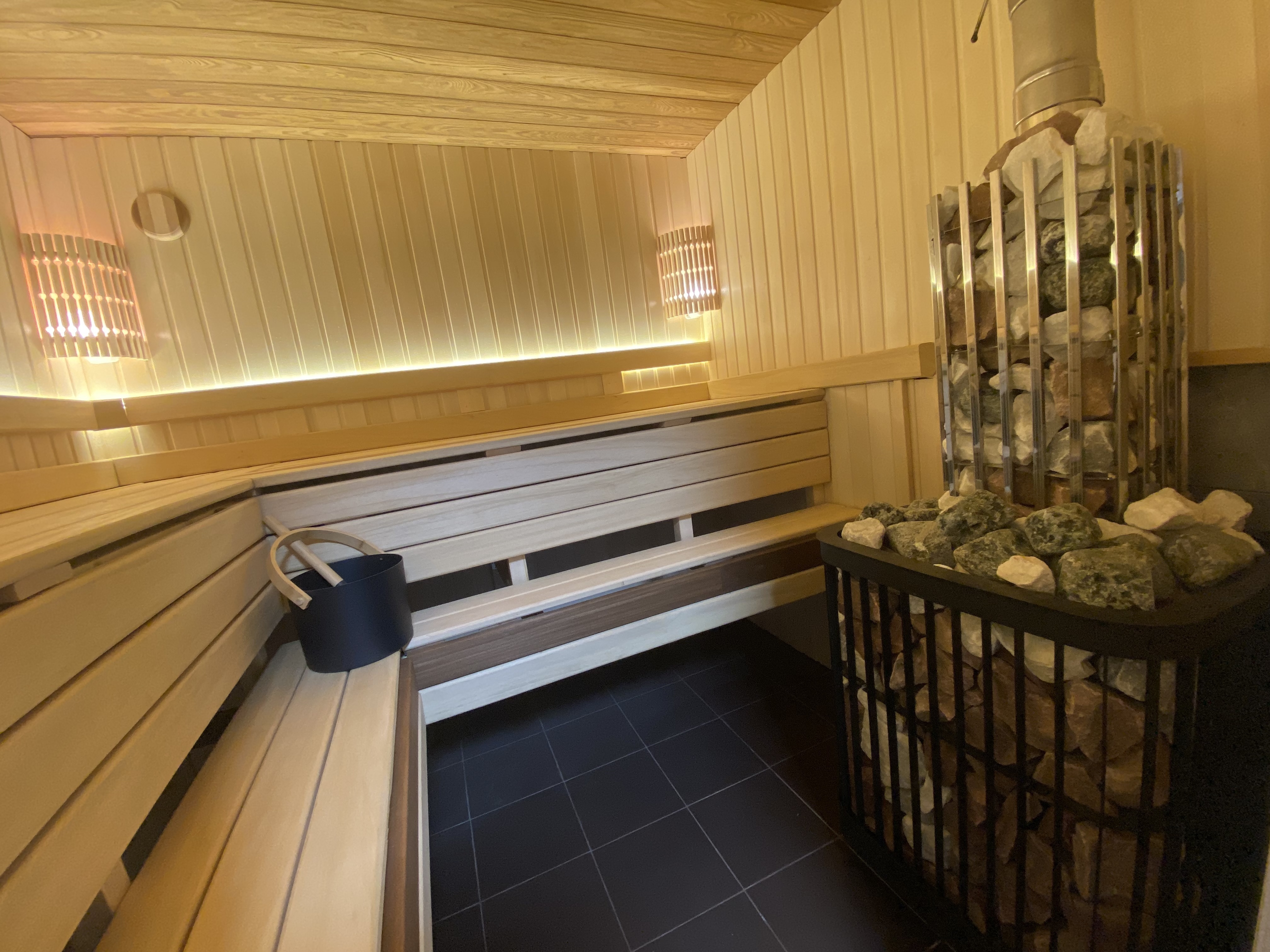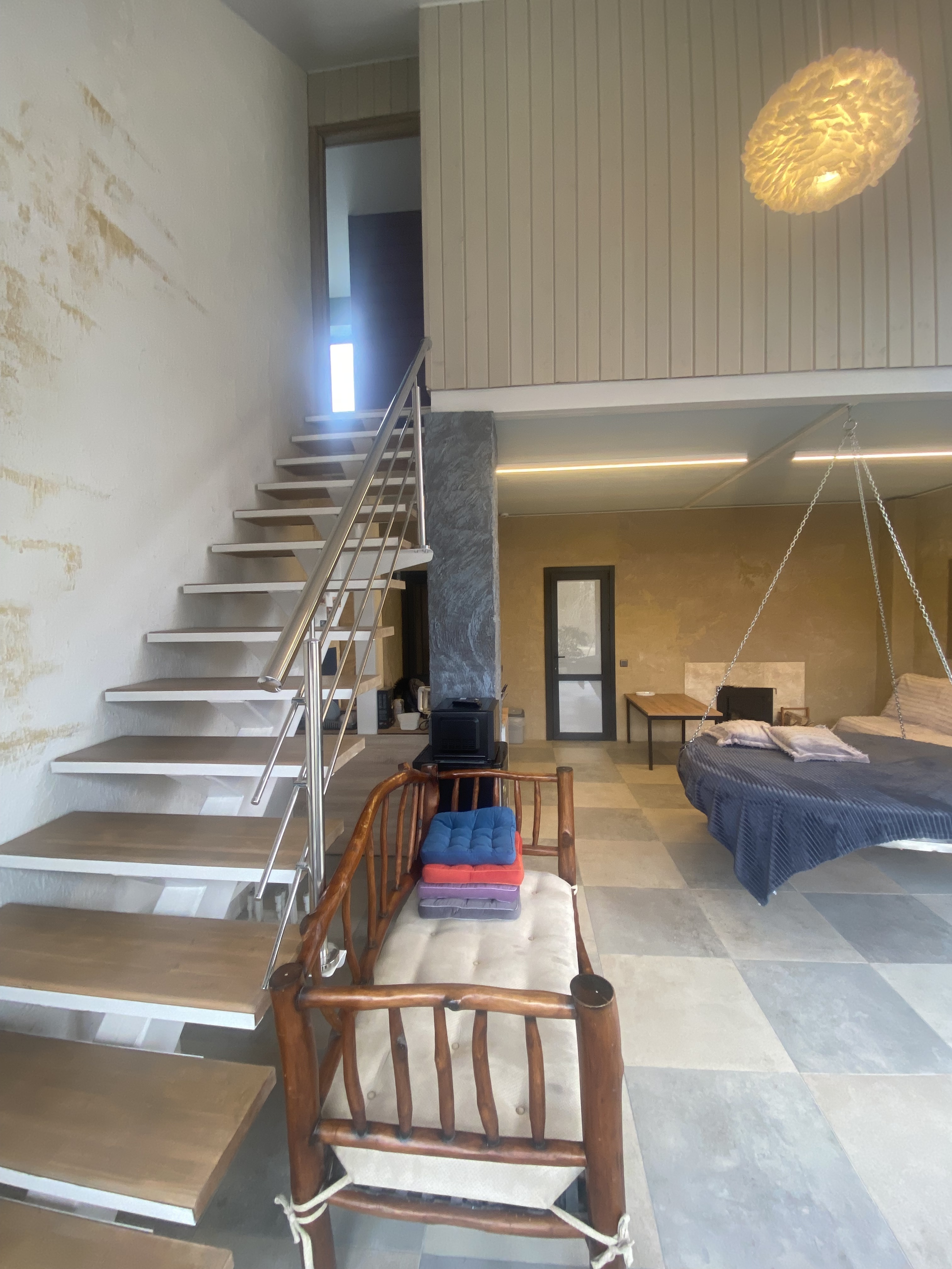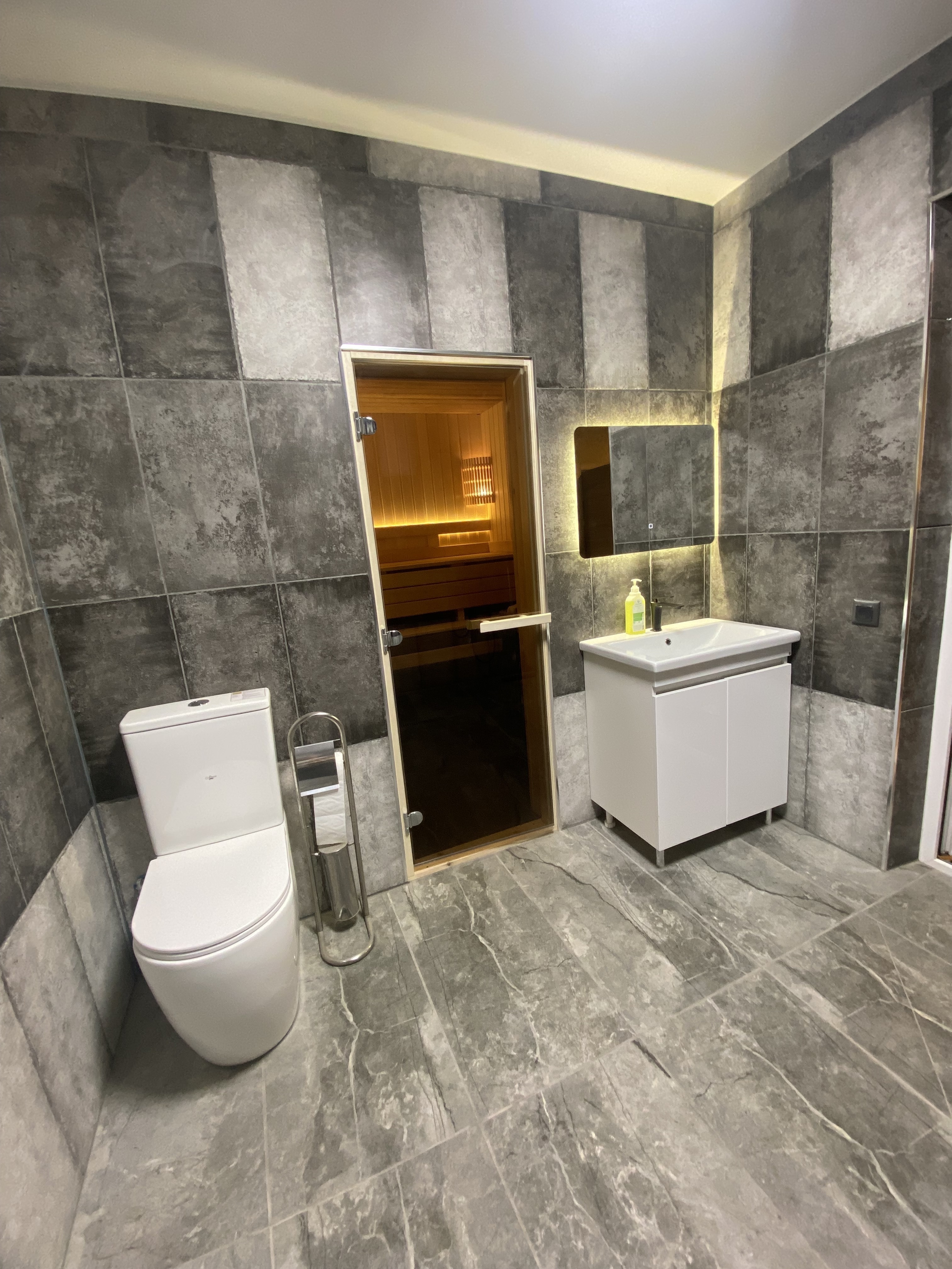 Внутри дома - просторная комната отдыха с камином, раскладным диваном и подвесной кроватью на цепях. На первом, включая парилку, теплые полы. Есть умная колонка «Маруся», смарт телевизор. В доме 4 спальных места, мини-кухня, душевая, туалет, парилка на дровах.