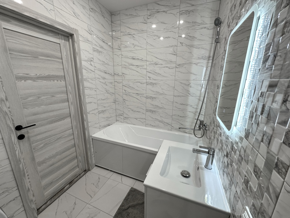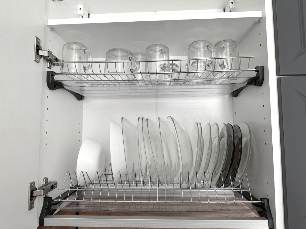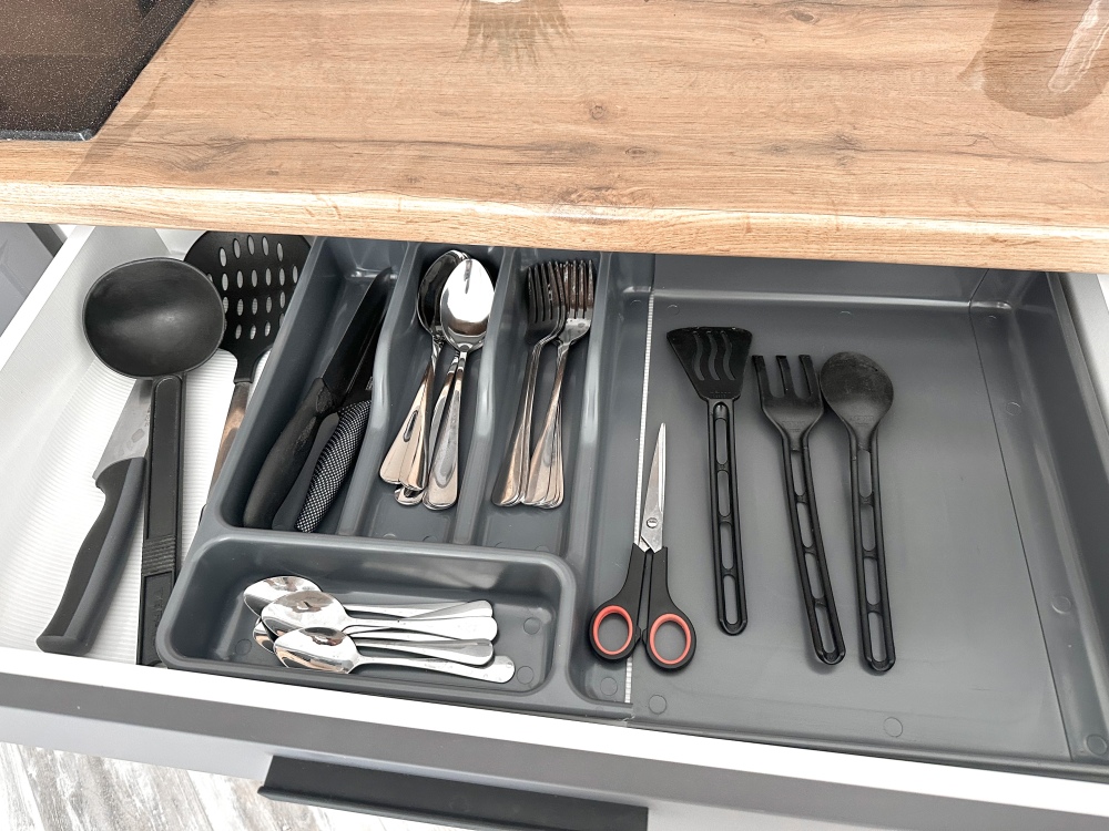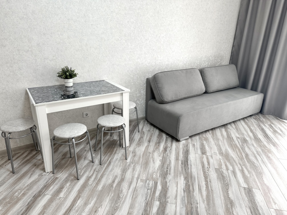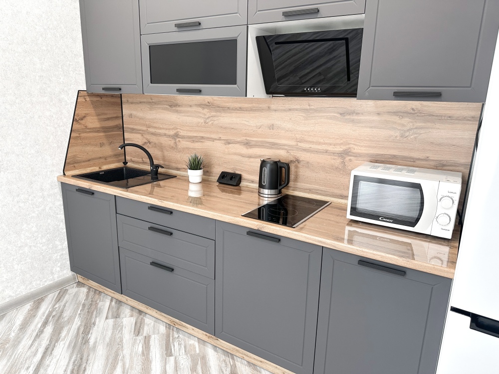 В наличии просторная кухня с микроволновкой, плитой, холодильником, а также двумя 2-спальными диванами.
