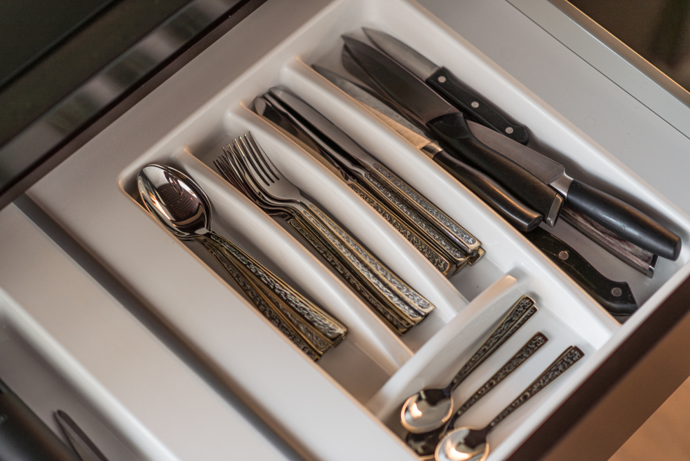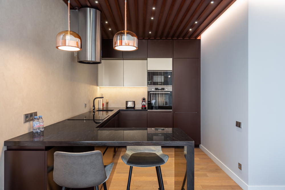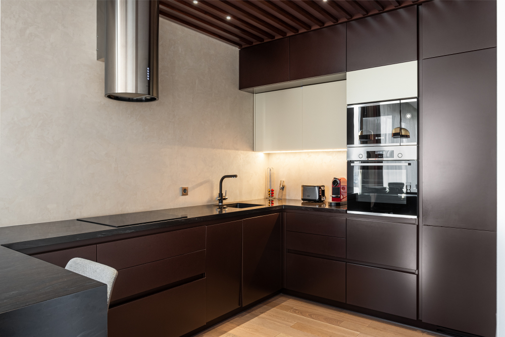 Кухня в духе современного минимализма - здесь есть всё, чтобы приготовить завтрак, ужин или просто заварить любимый чай. Варочная панель, духовка, кофемашина, чайник, посудомойка - полный фарш для поваров и не только.