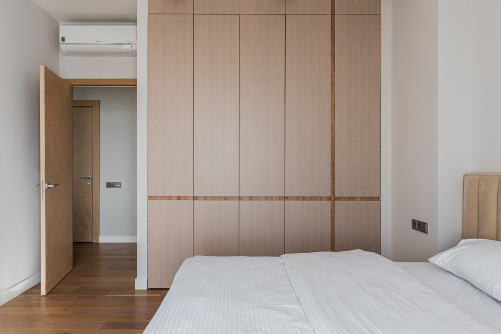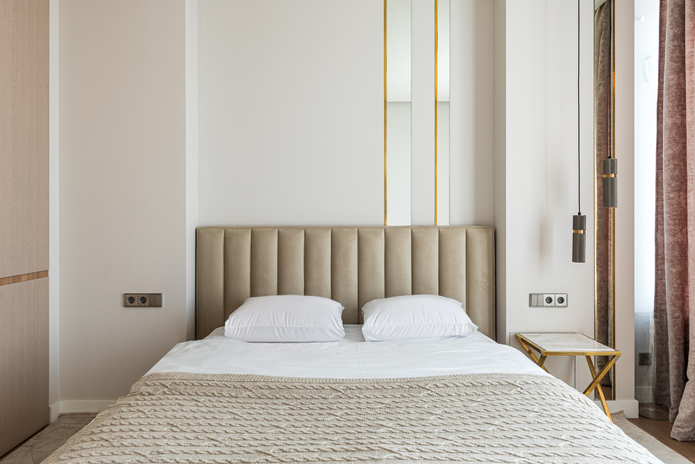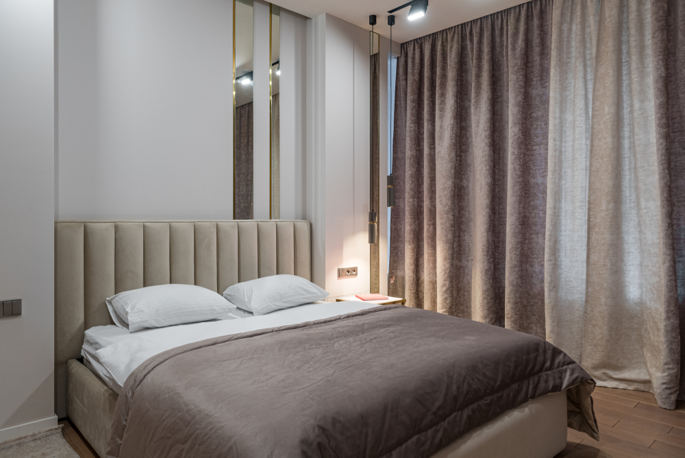 Большая спальня с мягкой кроватью - для комфортного сна и отдыха после насыщенного дня в Москве. Нежные оттенки, плотные шторы, уют - заходишь и сразу хочется остаться.