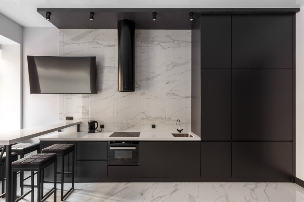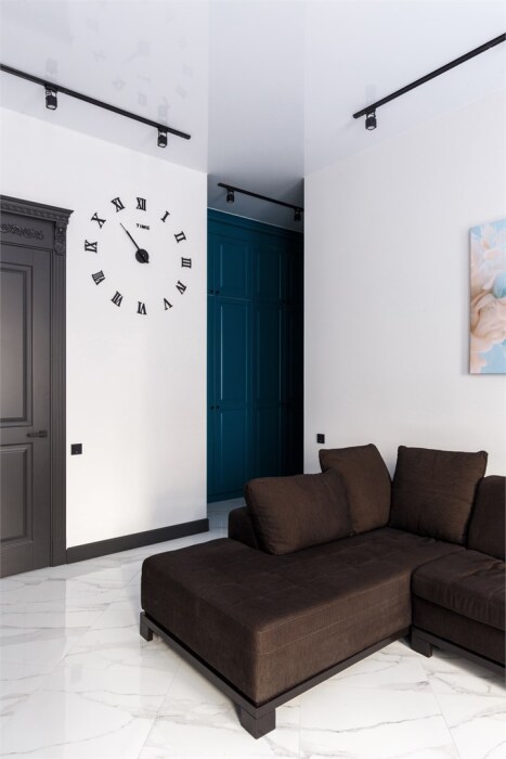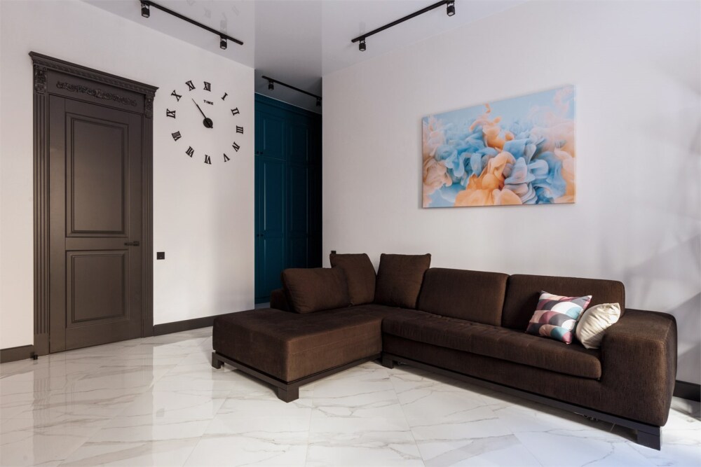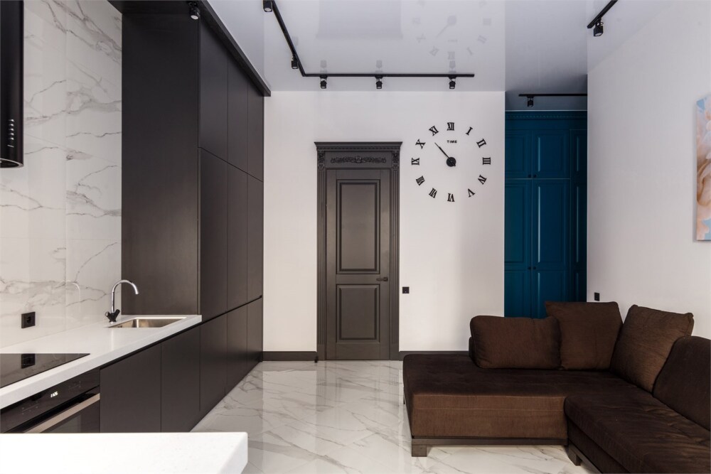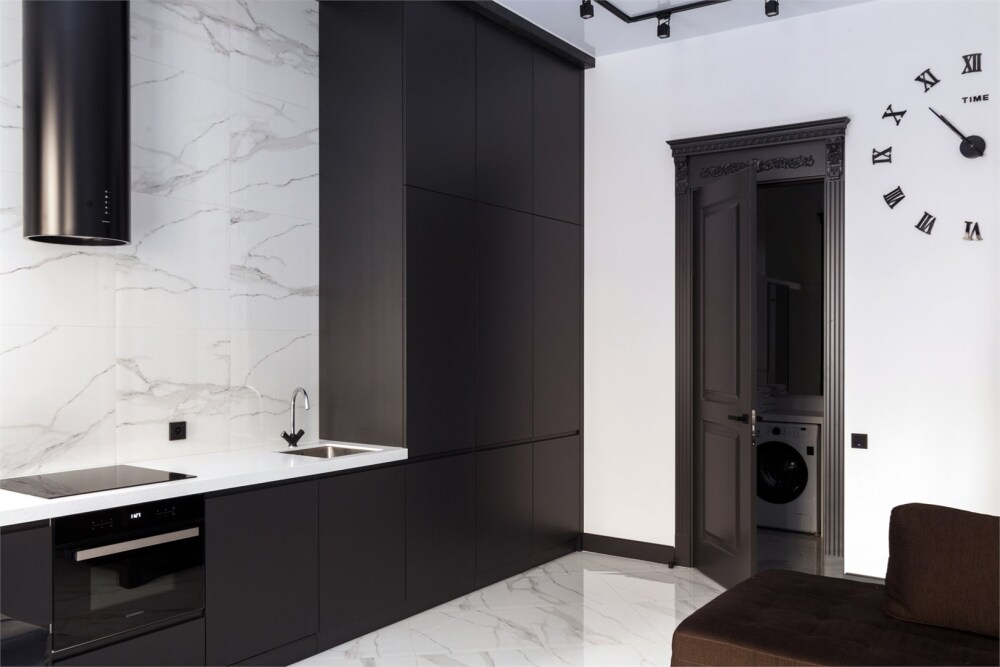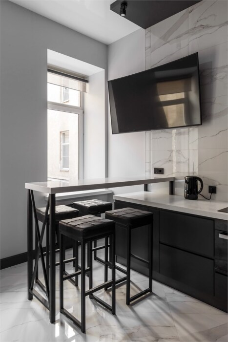- Удобная двуспальная кровать формата King Size, односпальный диван на кухне.