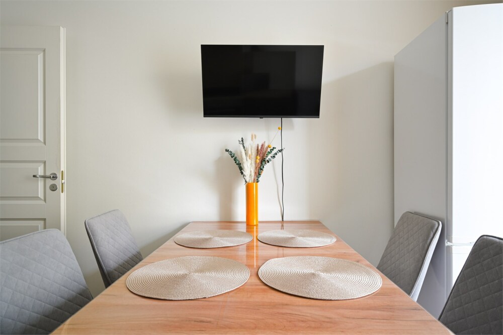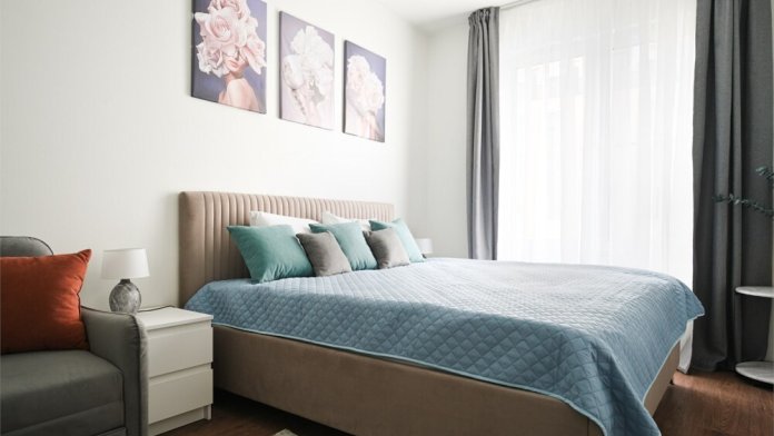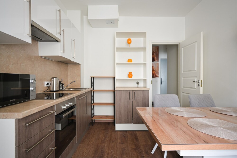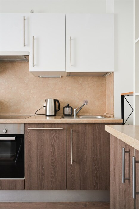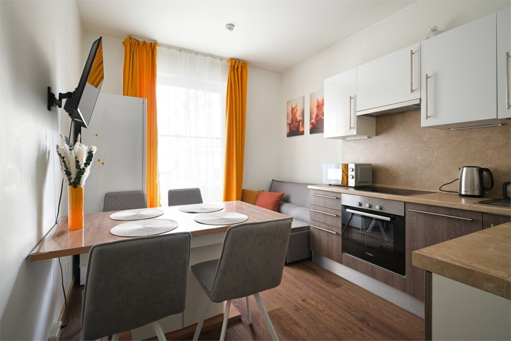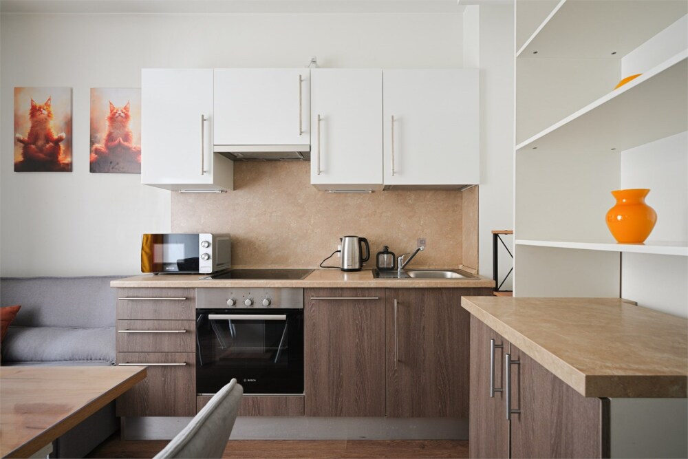 - Удобная двуспальная кровать 180 см с ортопедическим матрасом и односпальный диван в спальне, диван на кухне не раскладывается.