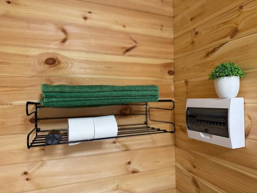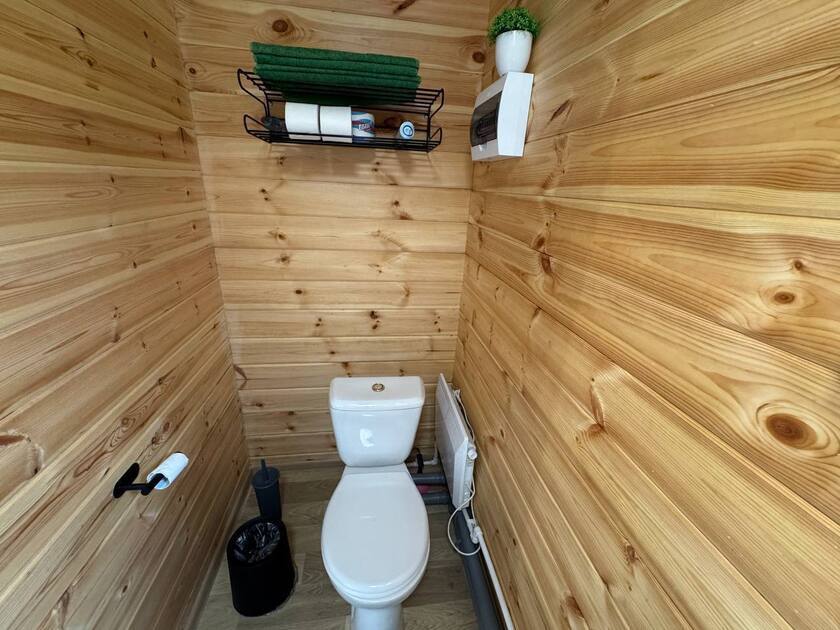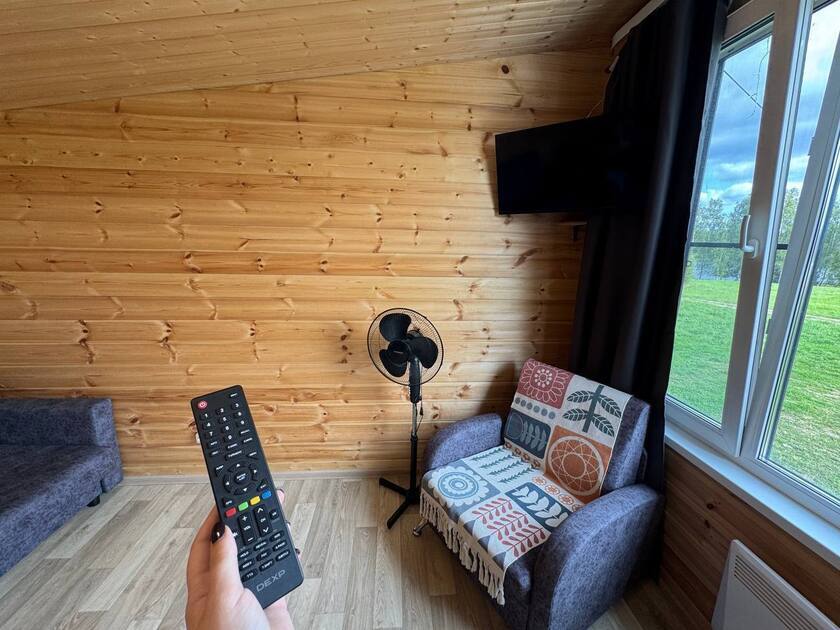 Домик вмещает в себя компанию до 8-х гостей: двуспальная кровать в изолированной спальной комнате, раскладной двухместный диван, односпальные кровати на мансардном этаже 4 шт., обеденная группа, ТВ, свежее постельное и полотенца, душ, раковина, унитаз, гигиенические принадлежности, кухонная зона (холодильник, чайник, плита, микроволновая печь), вся необходимая посуда для готовки и сервировки.