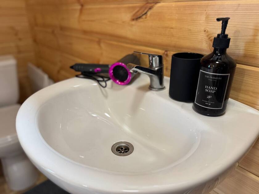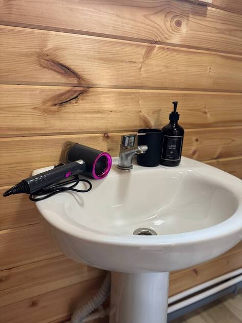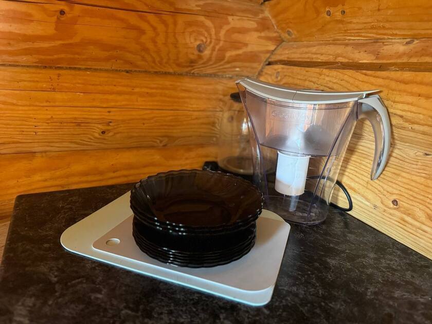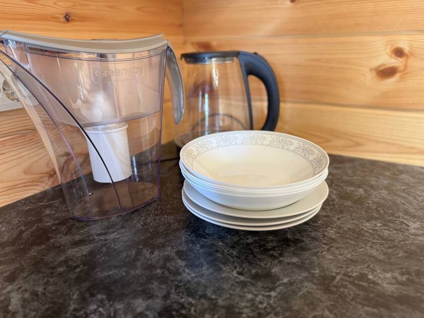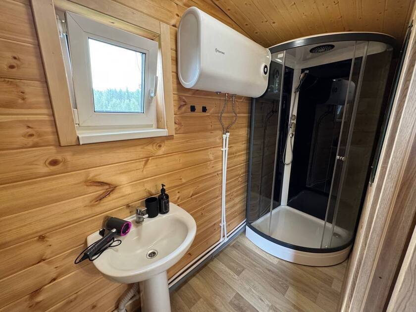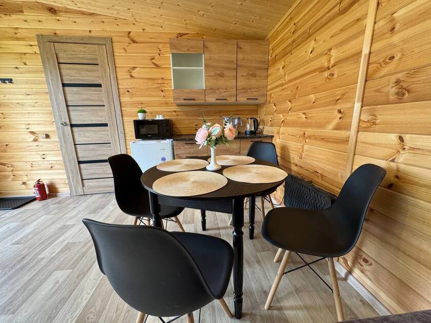 Домик вмещает в себя компанию до 4-х гостей, для Вашего комфорта: раскладной двухместный диван, односпальные кресла-кровати, обеденная группа для 4-х гостей, ТВ, свежее постельное и полотенца, душ, раковина, унитаз, гигиенические принадлежности, кухонная зона (холодильник, чайник, плита, микроволновая печь), вся необходимая посуда для готовки и сервировки.