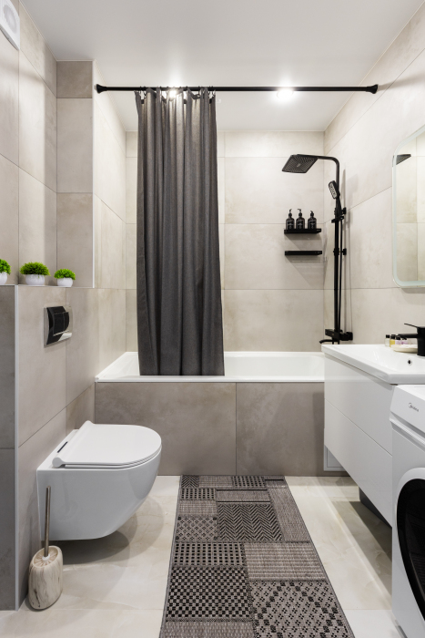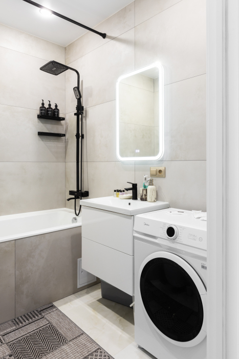 Современный санузел с ванной укомплектован стиральной машиной и фирменными косметическими наборами Flat Inn. Для удобства гостей предусмотрены кондиционер, Wi-Fi и вместительная гардеробная. Для автомобилистов доступна закрытая подземная парковка.