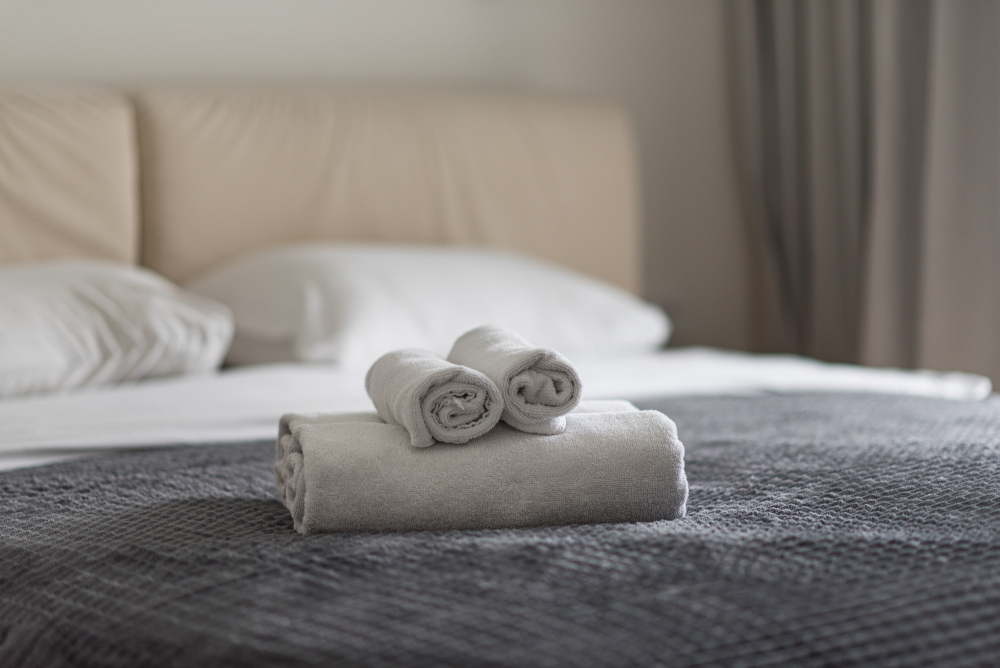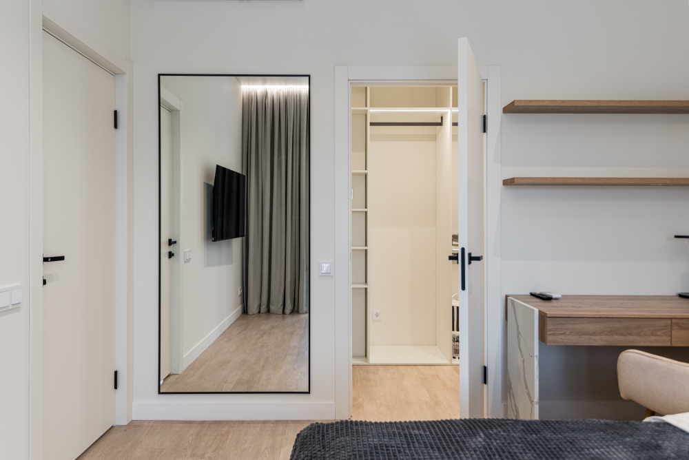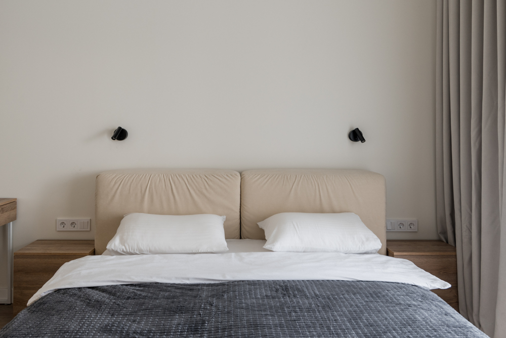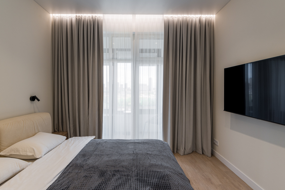 - Спальня с двуспальной кроватью, ТВ и затемняющими шторами.