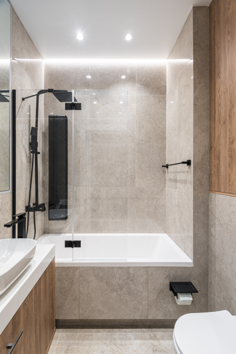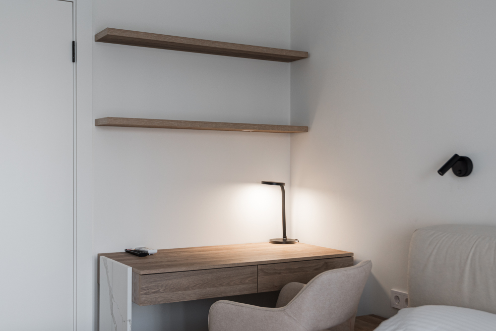 Светлая, уютная квартира с панорамными окнами и дизайнерской отделкой. Пространство зонировано: спальня, кухня, рабочая зона. Спокойные оттенки, натуральные материалы и мягкое освещение создают атмосферу уюта и комфорта.