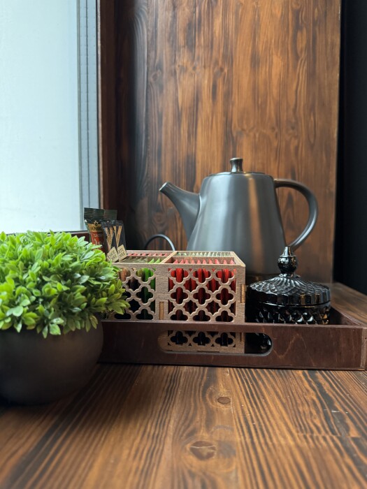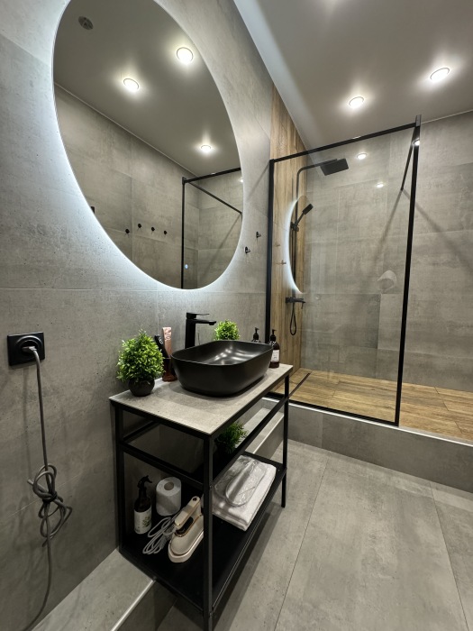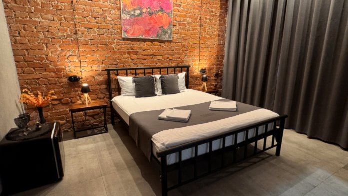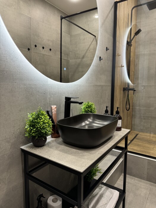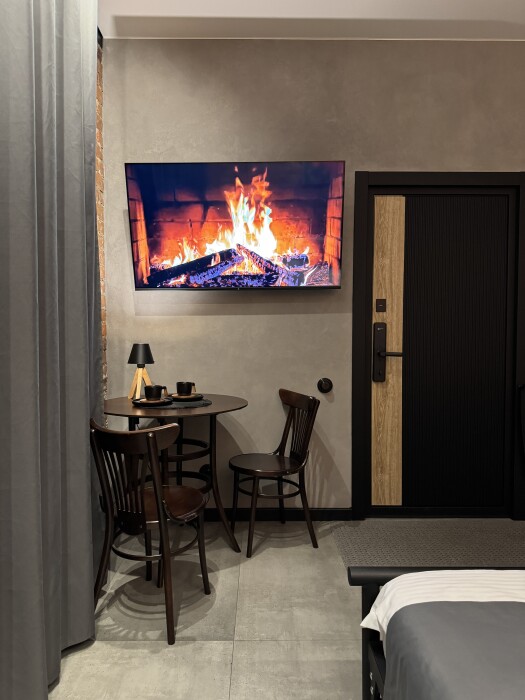 В комнате спокойно, уютно и тепло, шторы блэкаут. Просторная душевая с регулируемым теплым полом и средствами гигиены (мыло, шампунь, зубная паста и щетка, туалетная бумага), удобный фен для сушки волос, банные полотенца, полотенца для рук, коврики для ног, тапочки. Круглый стол с венскими стульями, мини-холодильник, чайник, чашки, чайные ложки, бокалы, чай, вода, отпариватель. Большая удобная кровать с ортопедическим матрасом. Качественное белое белье премиум-класса. Высокоскоростной безлимитный Wi-fi, большой телевизор с функцией Смарт-ТВ, ниша для чемоданов, вешалки. Бризер с регулированием скорости притока воздуха. Кровать, вазоны для уличных цветов и кованые карнизы выполнены в Петрозаводской кузнице. Картины известного карельского художника Егора Кукушкина.