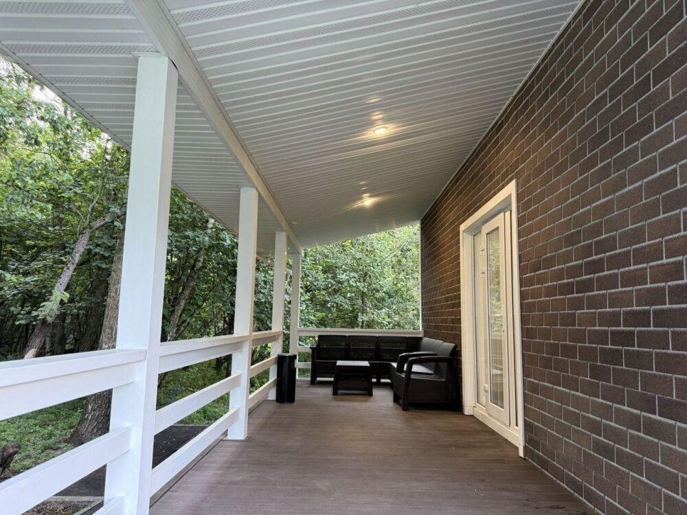 - Просторная терраса на первом этаже с выходом из кухни-гостиной — идеальное место для утреннего кофе или вечерних посиделок с друзьями.