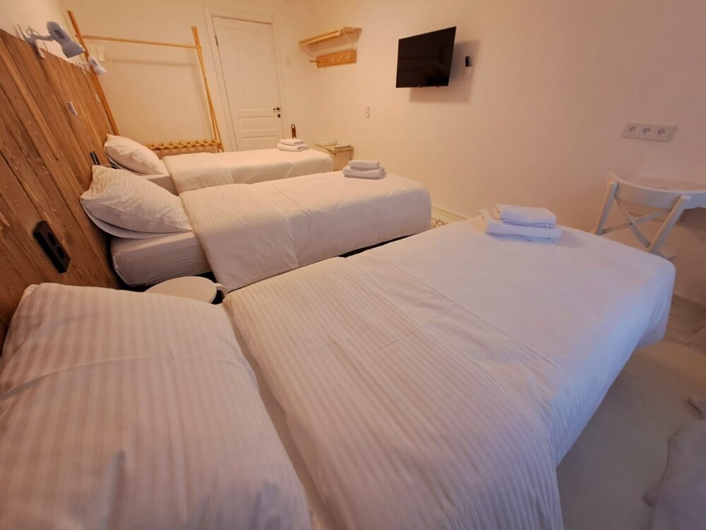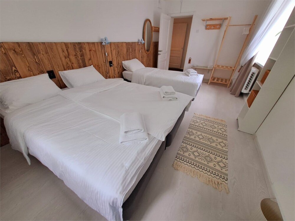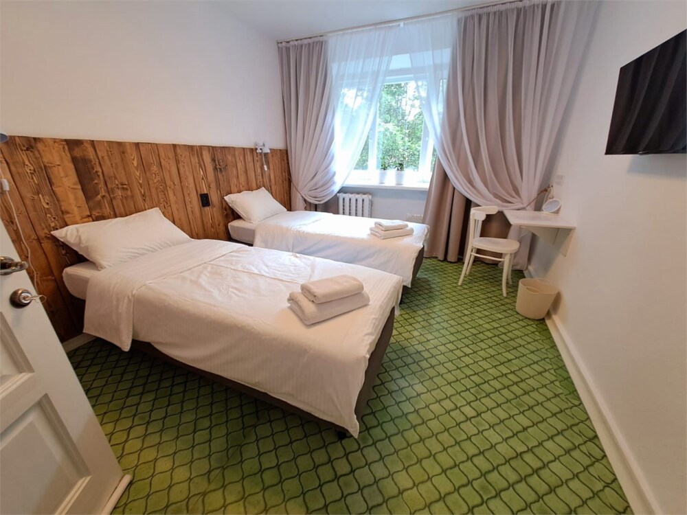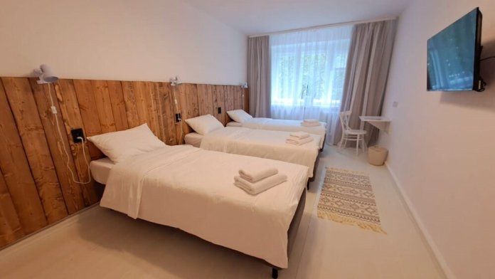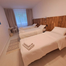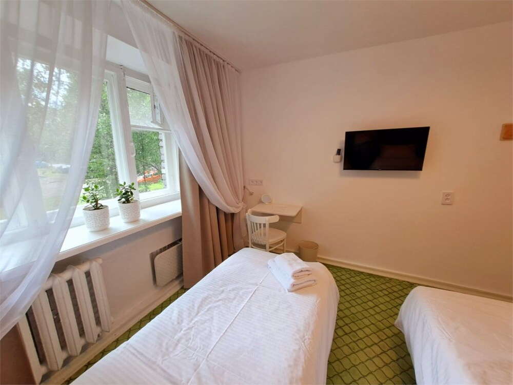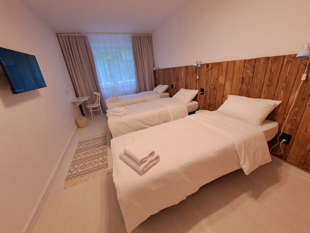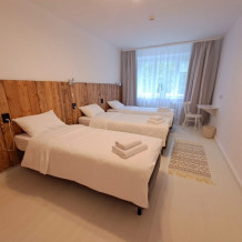В номере есть всё необходимое для комфортного проживания: три односпальные кровати, стойка с плечиками, стол, стул, светонепроницаемые шторы, держатели для горнолыжного оборудования, тапочки. Также к Вашим услугам телевизор со Smart-tv, обогреватель, сушилка для обуви.