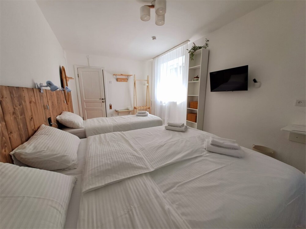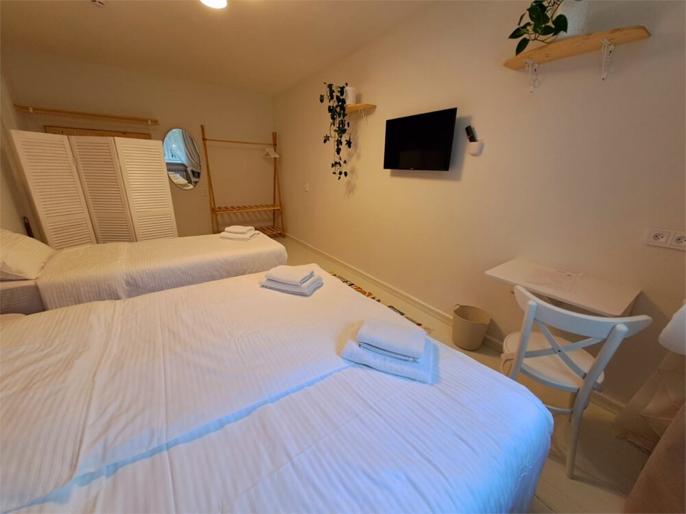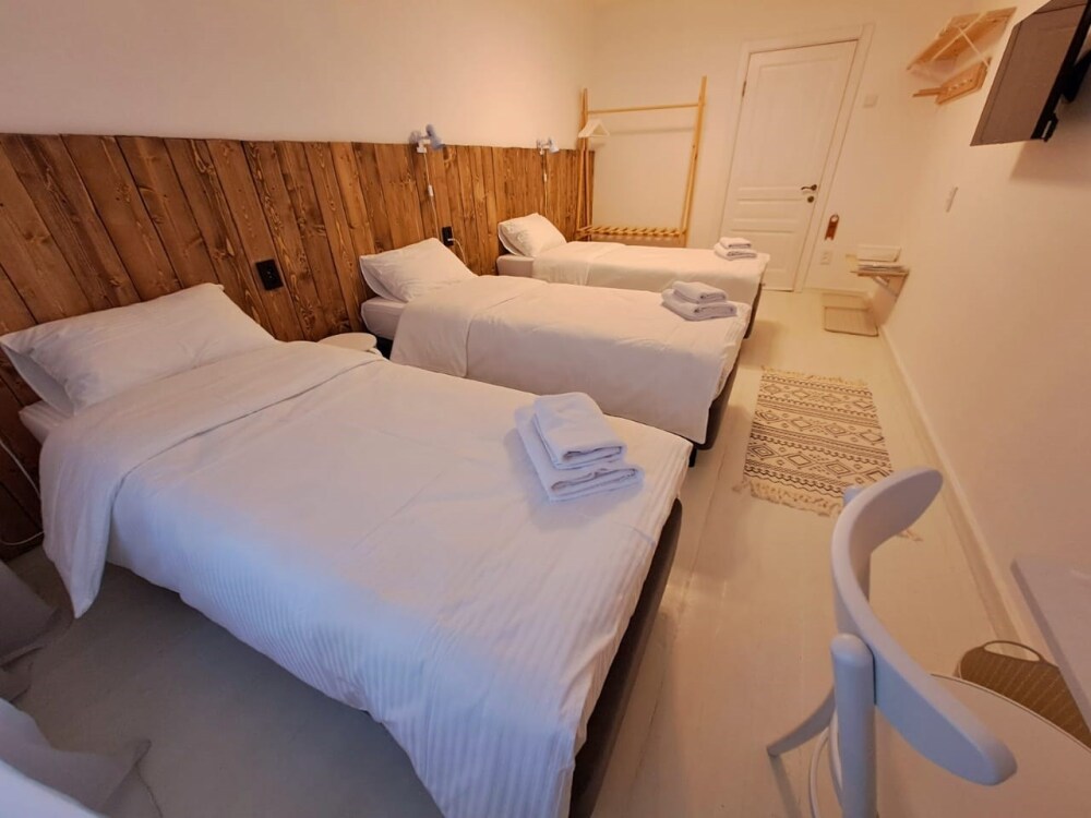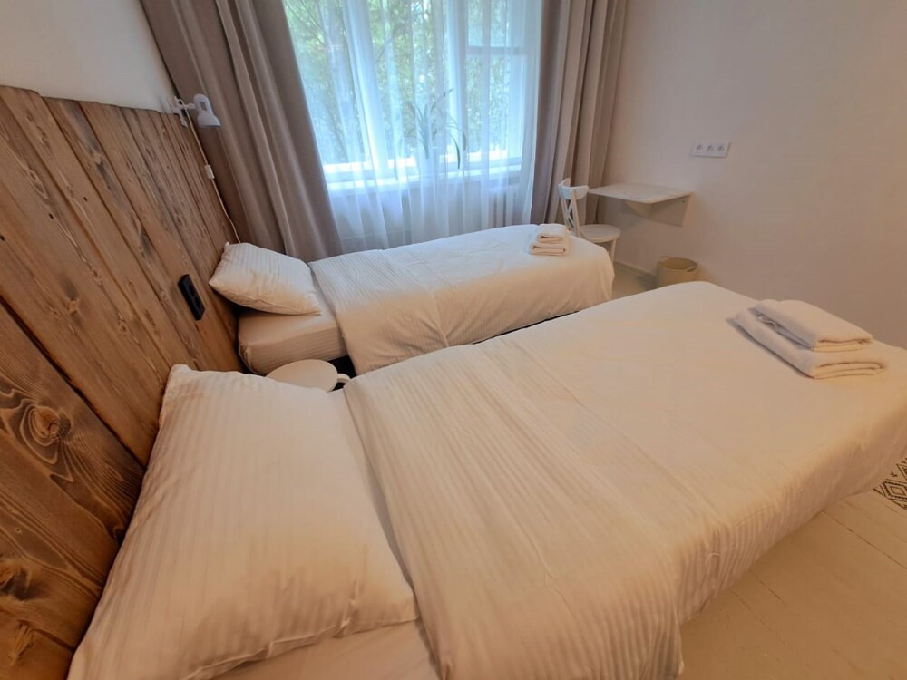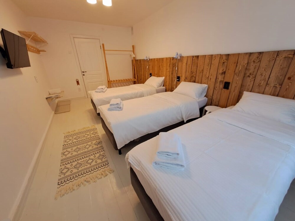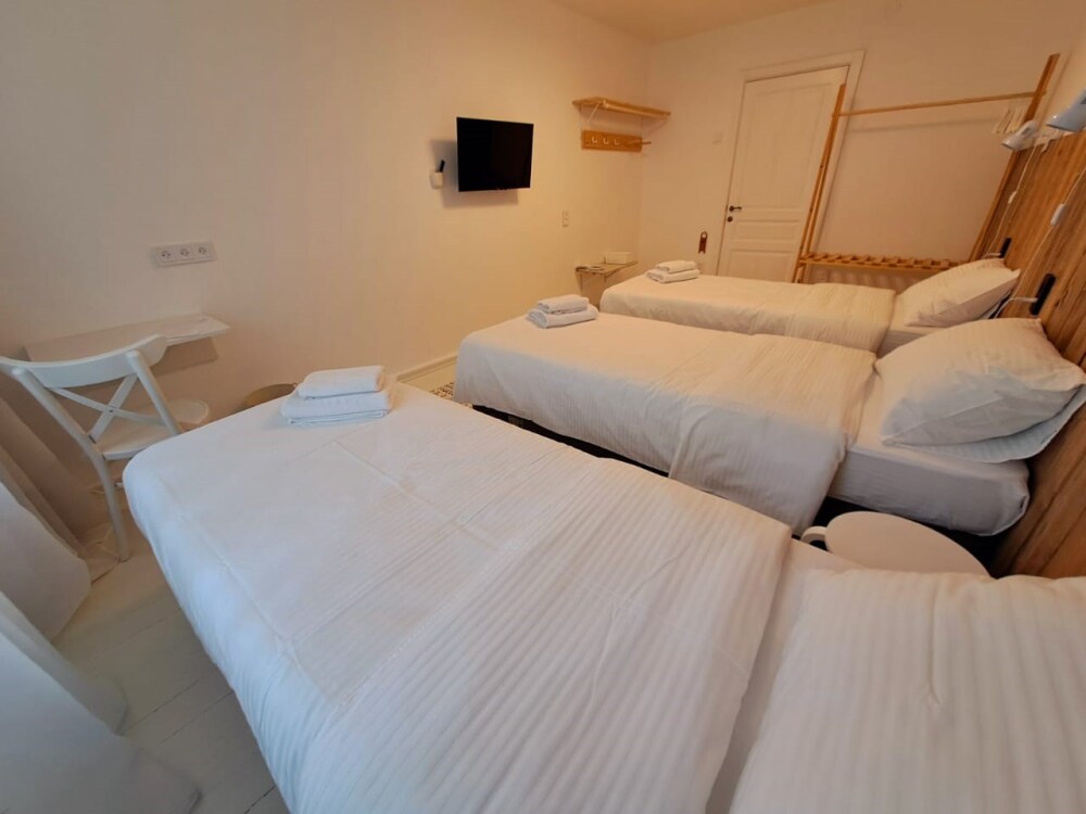 В номере есть всё необходимое для комфортного проживания: три односпальные кровати, стойка с плечиками, стол, стул, светонепроницаемые шторы, держатели для горнолыжного оборудования, тапочки. Также к Вашим услугам телевизор со Smart-tv, обогреватель, сушилка для обуви.