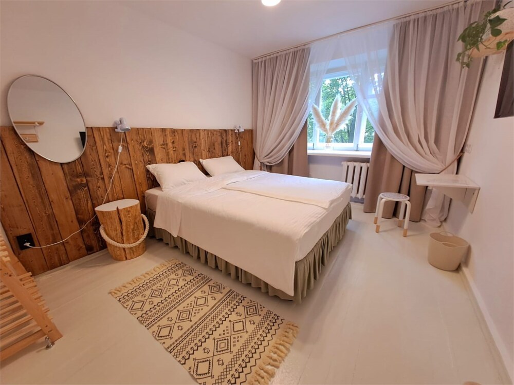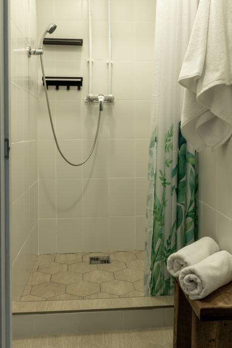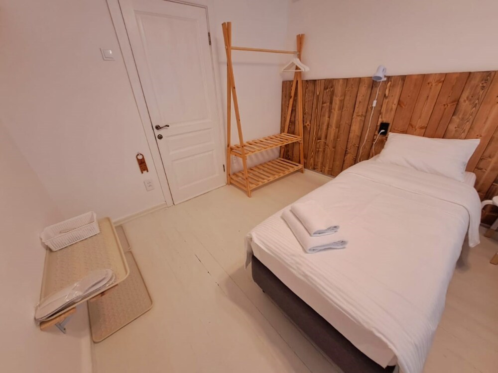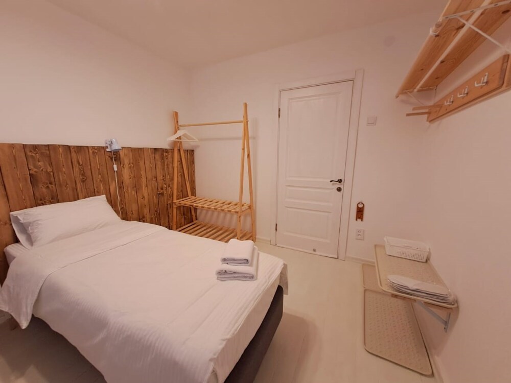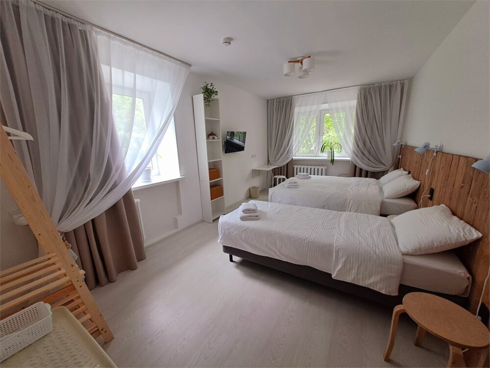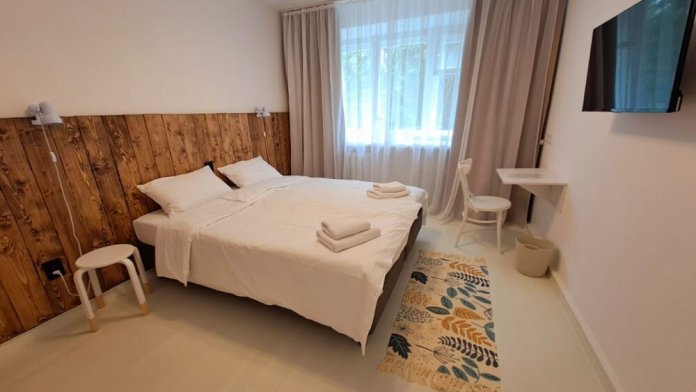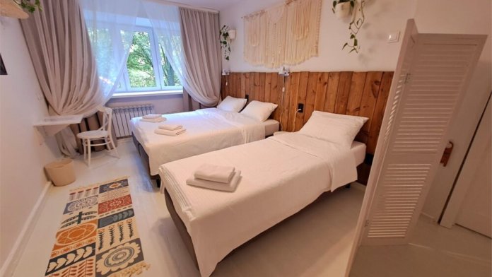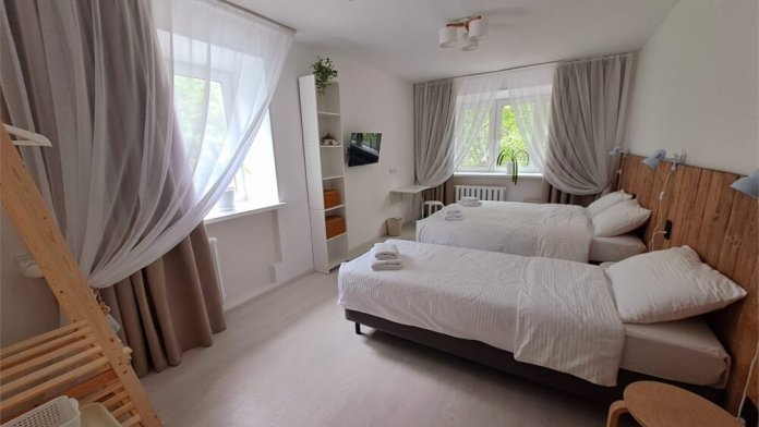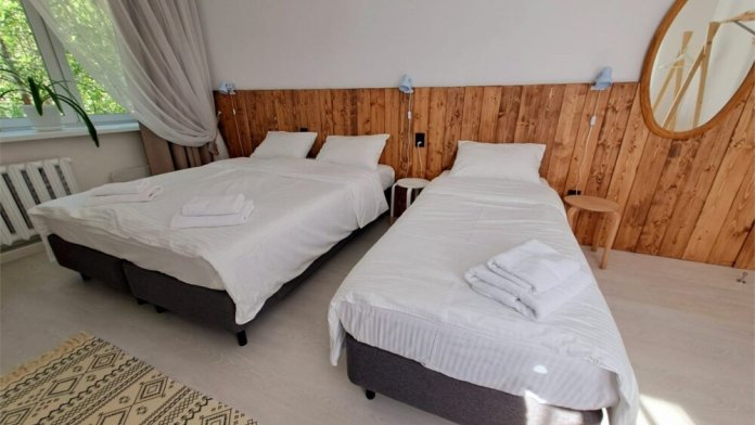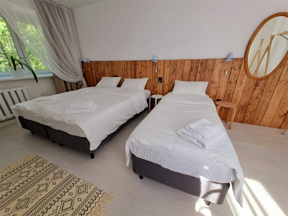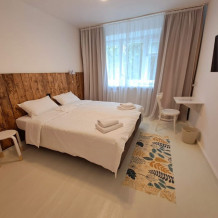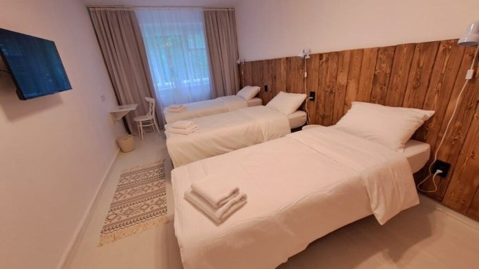 В номере есть всё необходимое для комфортного проживания: удобные кровати (двуспальная и односпальная), стойка с плечиками, стол, стул, стеллаж, светонепроницаемые шторы, держатели для горнолыжного оборудования, тапочки. Также к вашим услугам телевизор со Smart-tv, обогреватель, сушилка для обуви. Номер без санузла. Туалеты, душевые, кухня и умывальная комната находятся на этаже.