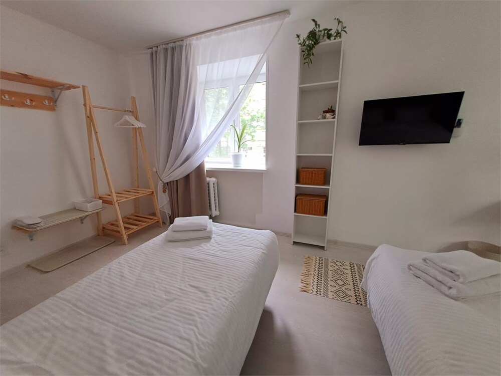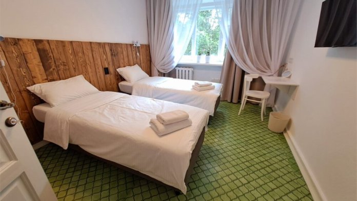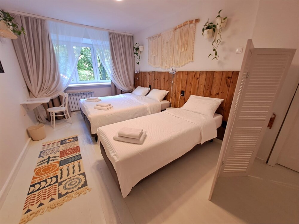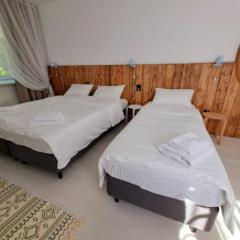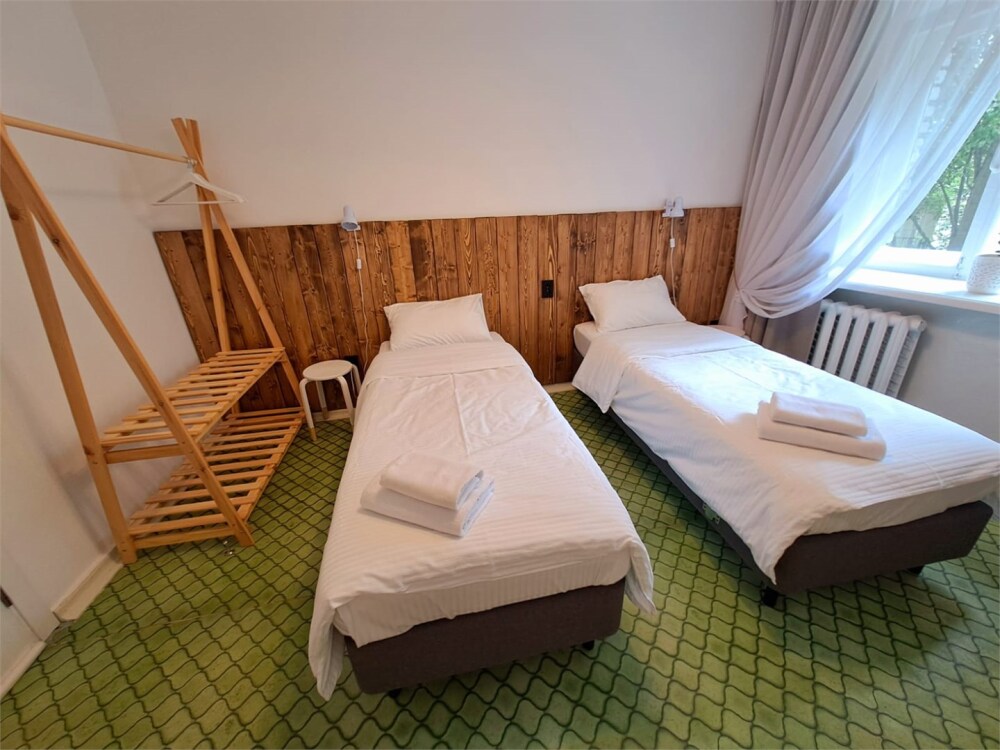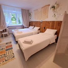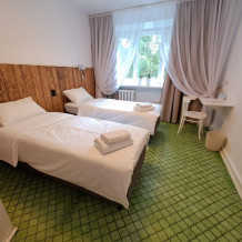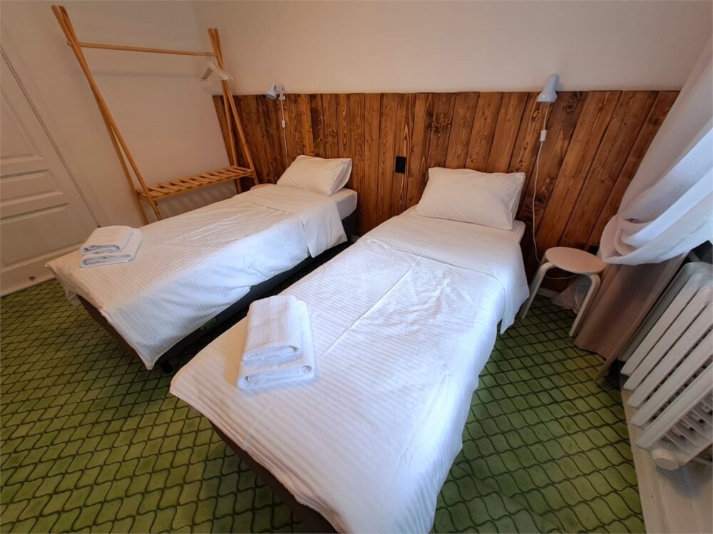 В номере есть всё необходимое для комфортного проживания: 2 удобные односпальные кровати, стойка с плечиками, стол, стул, светонепроницаемые шторы, держатели для горнолыжного оборудования, тапочки. Также к Вашим услугам телевизор со Smart-tv, обогреватель, сушилка для обуви.