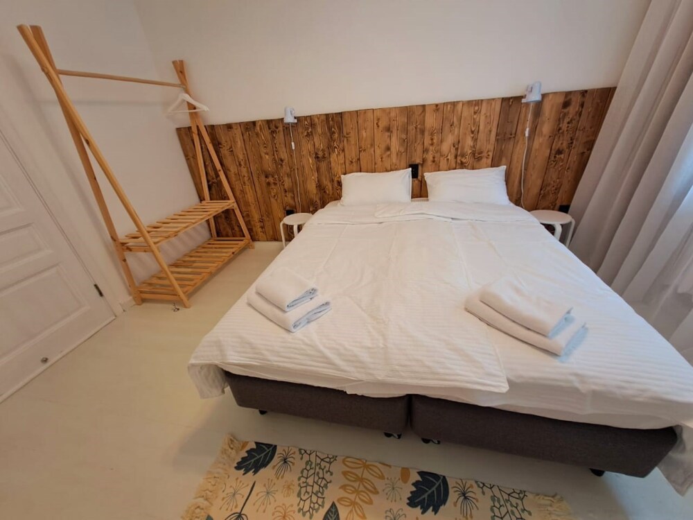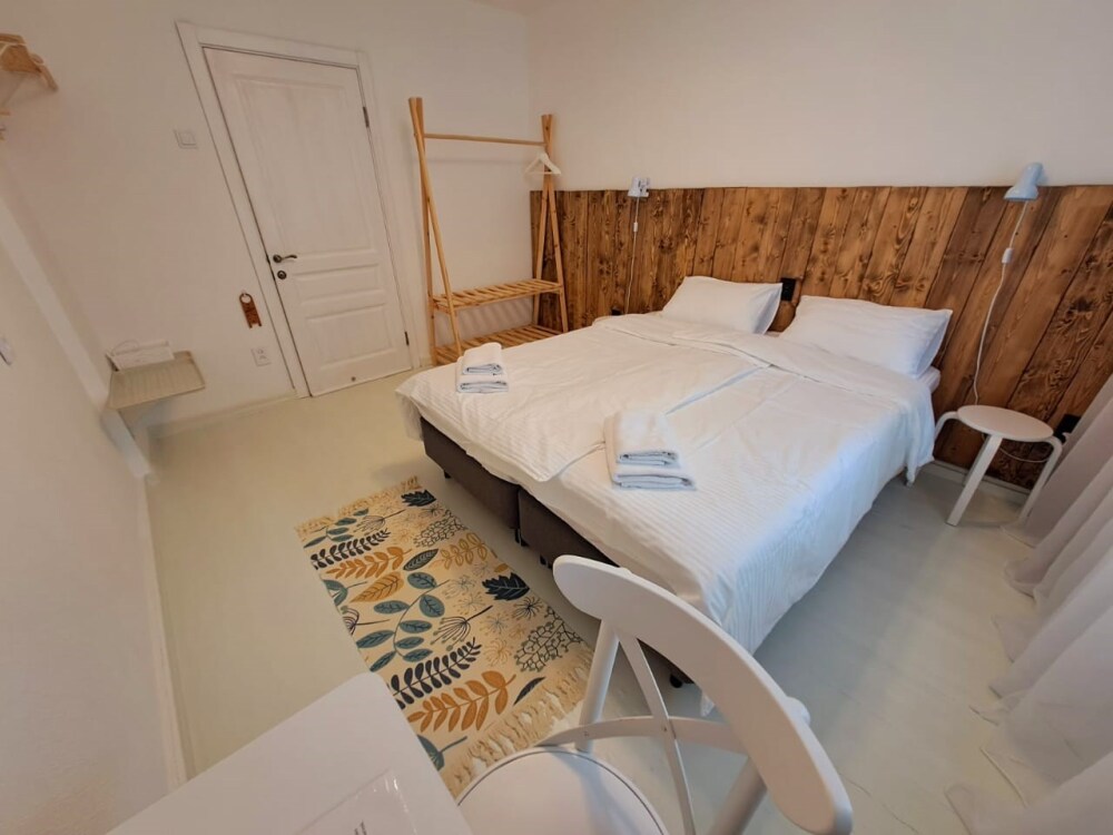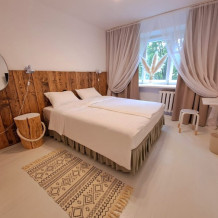Кровати: 2 односпальные или большая двуспальная кровать. В номере есть всё необходимое для комфортного проживания: удобная двуспальная кровать, стойка с плечиками, стол, стул, зеркало, светонепроницаемые шторы, держатели для горнолыжного оборудования, тапочки. Также к Вашим услугам телевизор со Smart-tv, обогреватель, сушилка для обуви.