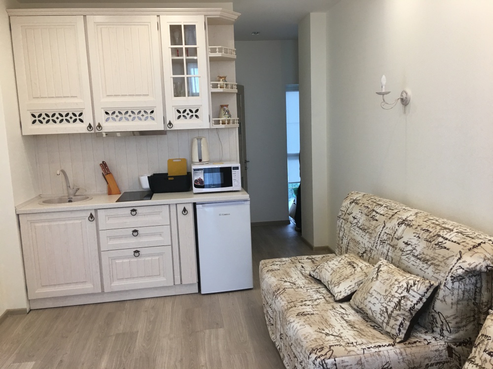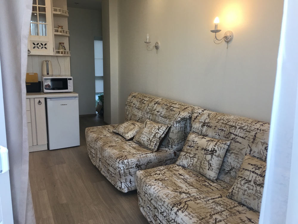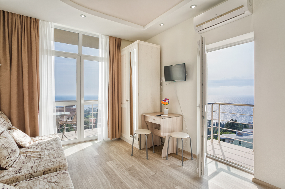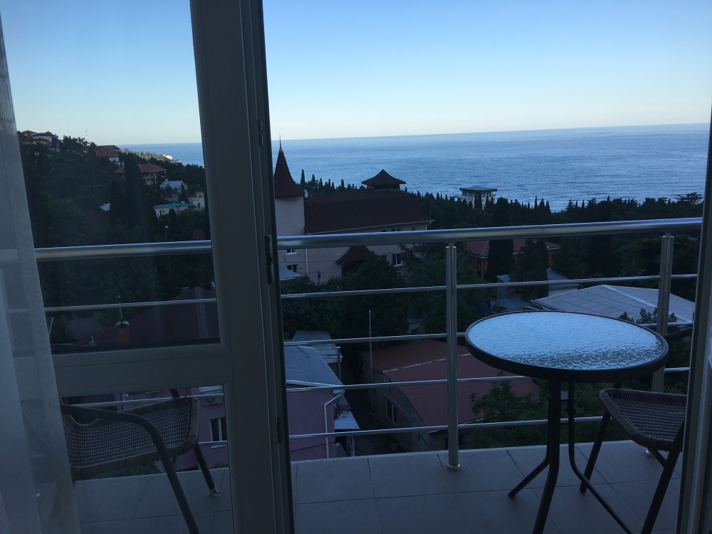 Квартира на втором этаже. Включает в себя: кухня-студио, двухспальный диван, два кресла-кровати, санузел с душевой кабиной, фен, шкаф - купе, ТВ и Wi-Fi, посуда, электрочайник, 2-комфорочная плита, кондиционер, холодильник, микроволновка, посуда, постель, полотенце, утюг, панорамное остекление с видом на море, гору Ай -Петри и скалу Дива.