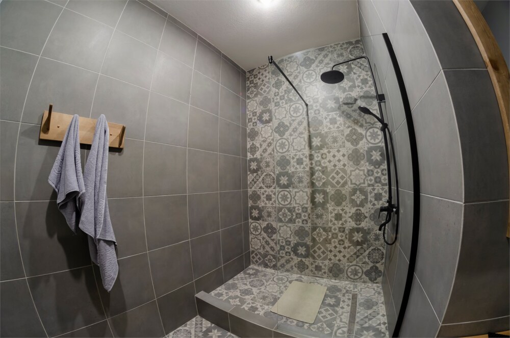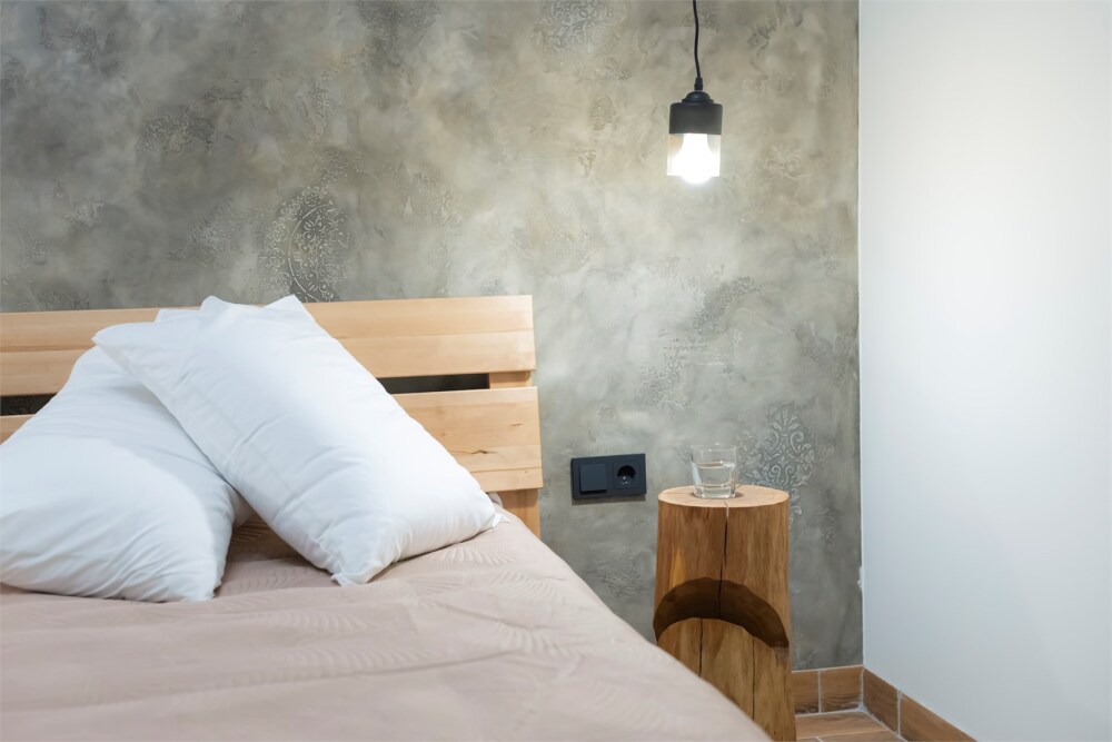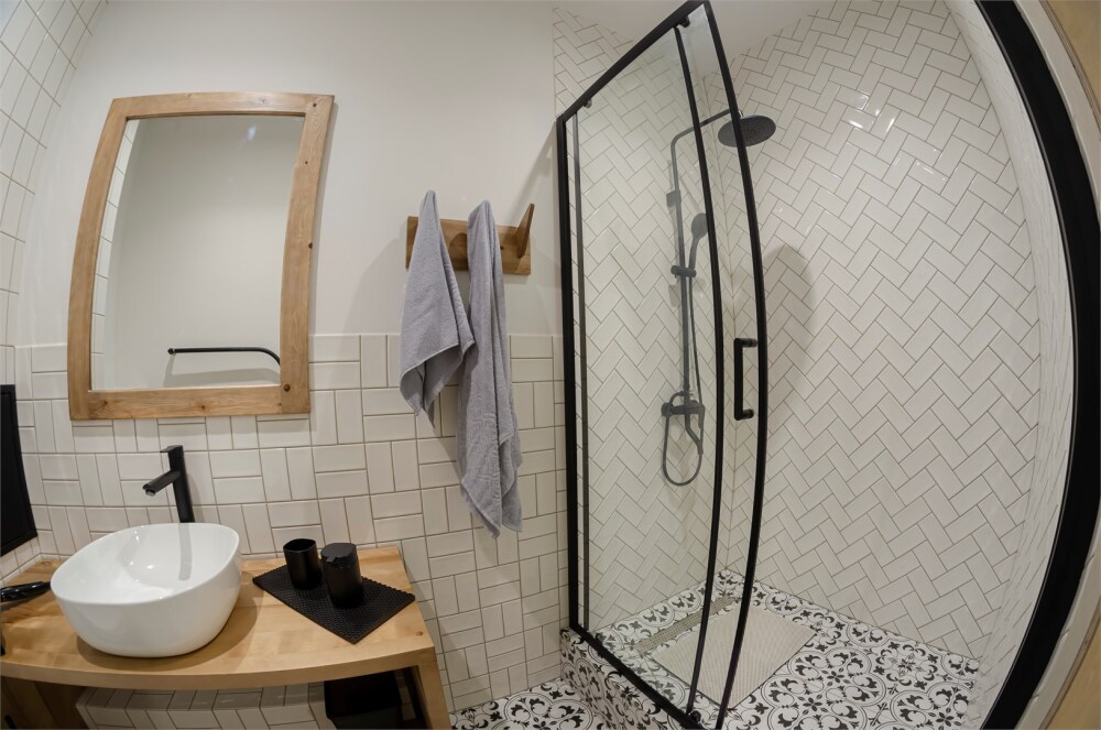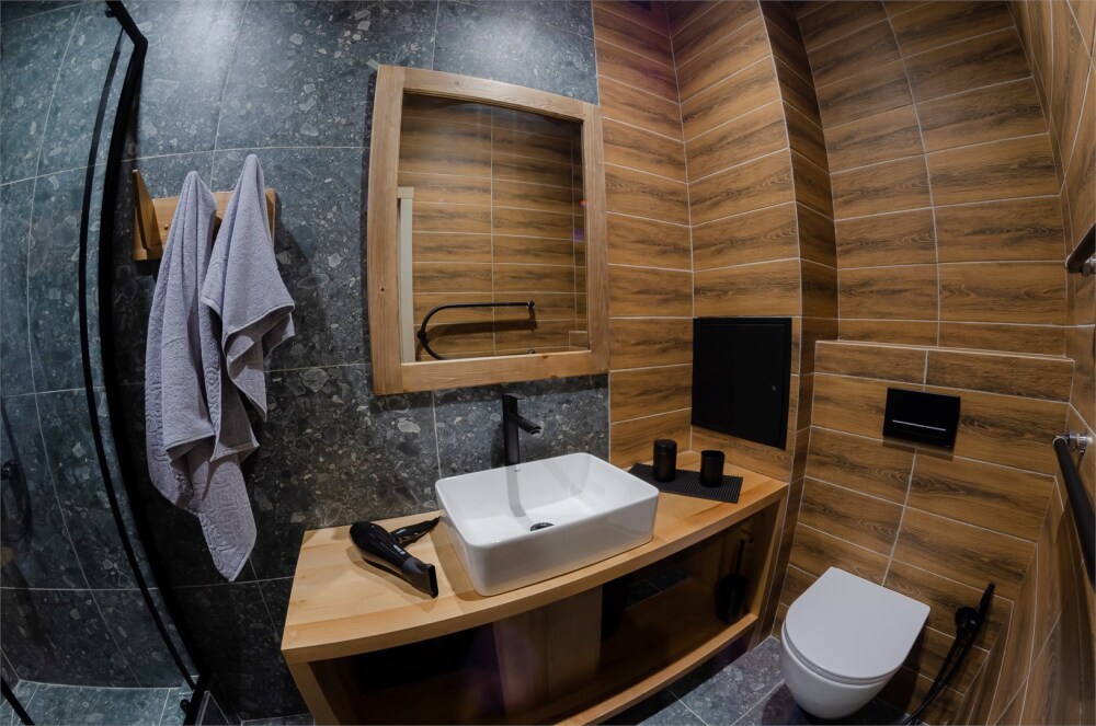 Спальня оборудована двуспальной кроватью с ортопедическим матрасом и зоной для хранения вещей. Ванная комната имеет душ, раковину, туалет, а также фен, полотенца.