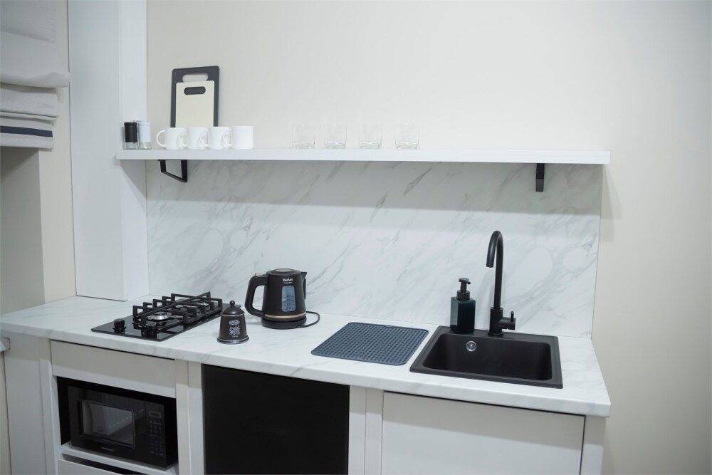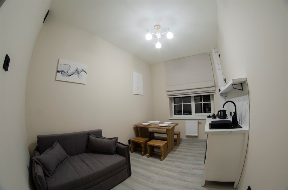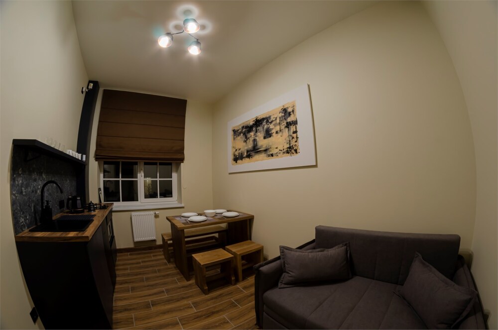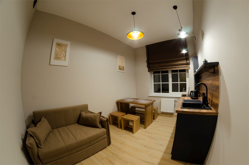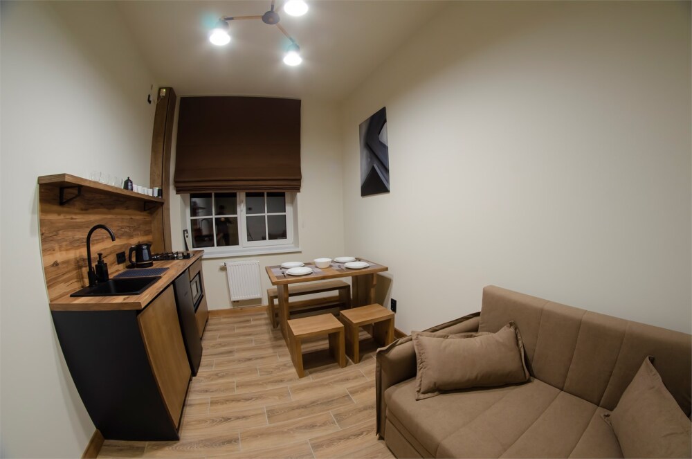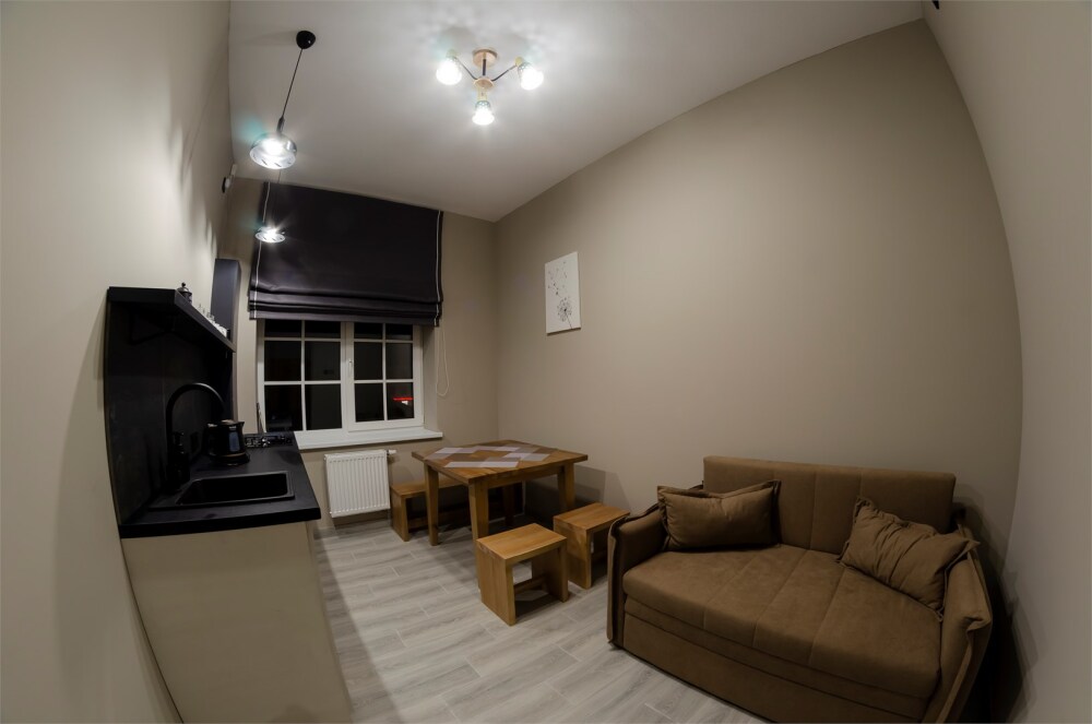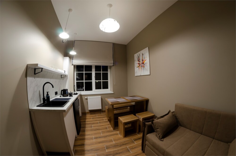 Кухня оснащена всем необходимым для приготовления пищи: холодильником, микроволновой печью, электрическим чайником и посудой. Также в номере есть уютная гостиная с раскладным диваном с шириной спального места 1200 мм., где Вы сможете отдохнуть после долгого дня.