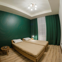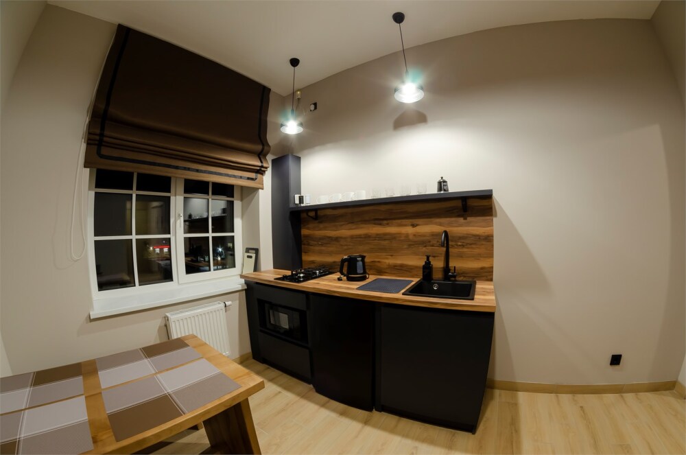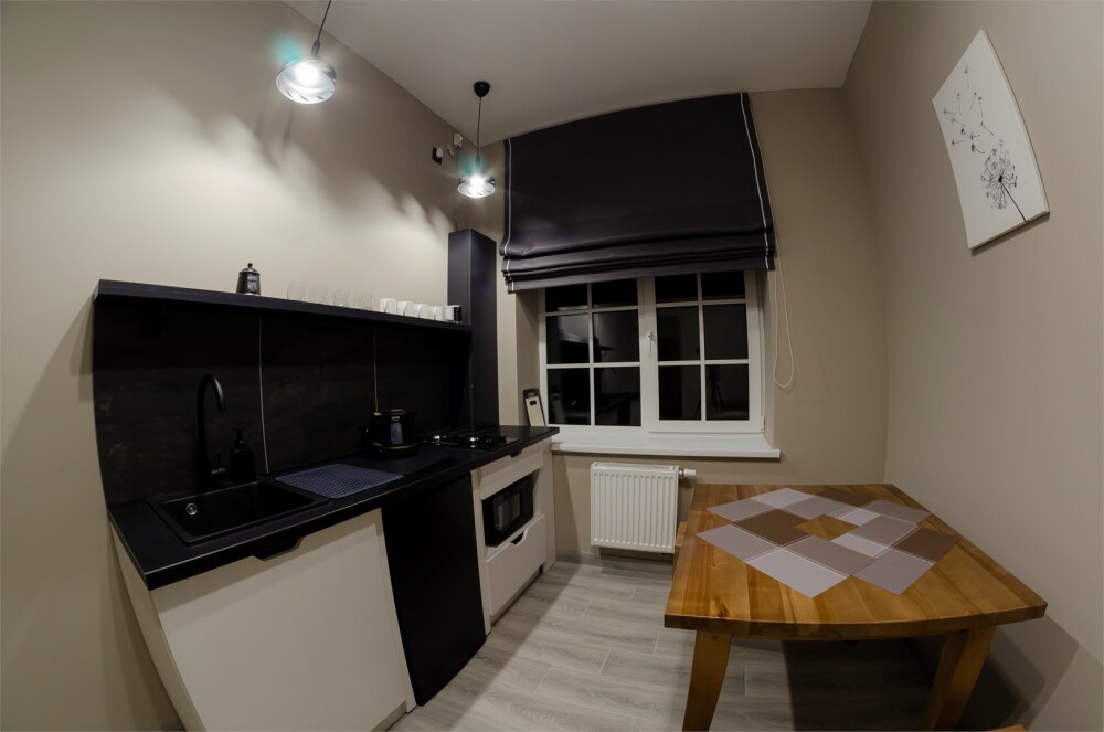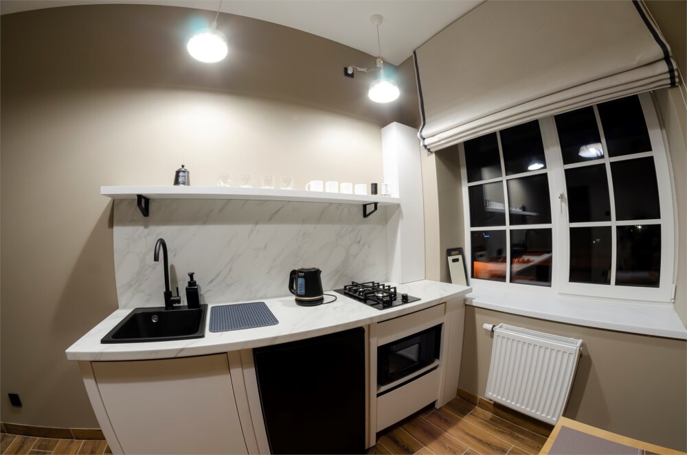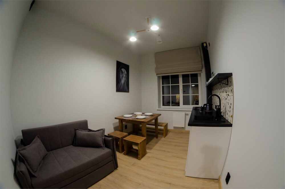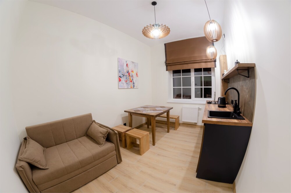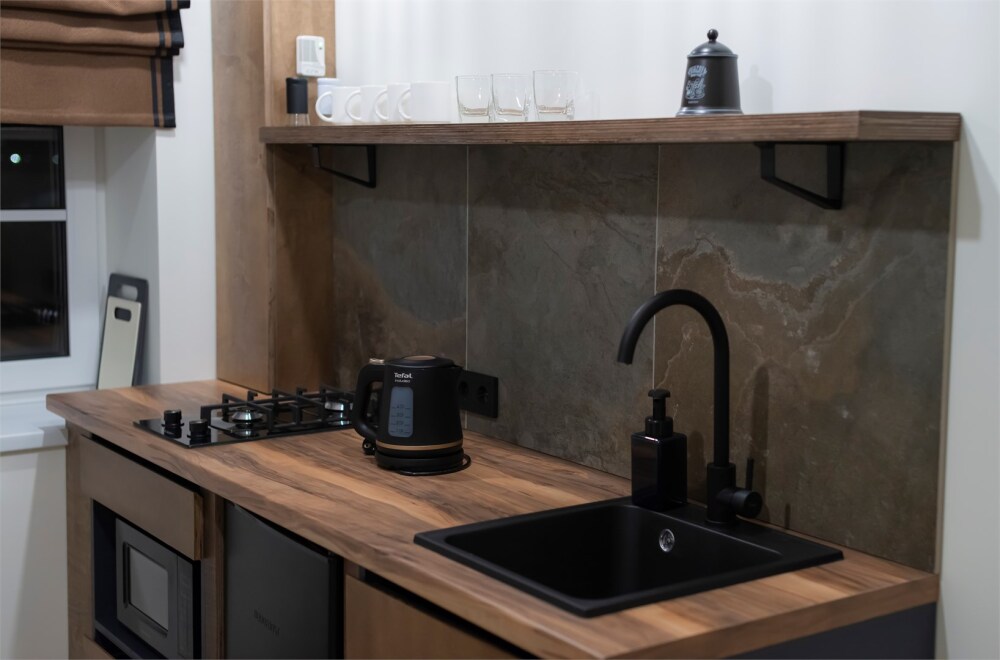 Кухня оснащена всем необходимым для приготовления пищи: холодильником, микроволновой печью, электрическим чайником и посудой. Также в номере есть уютная гостиная с раскладным диваном с шириной спального места 1200 мм., где Вы сможете отдохнуть после долгого дня.