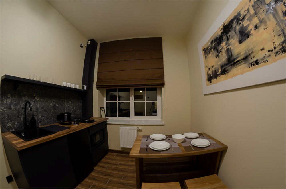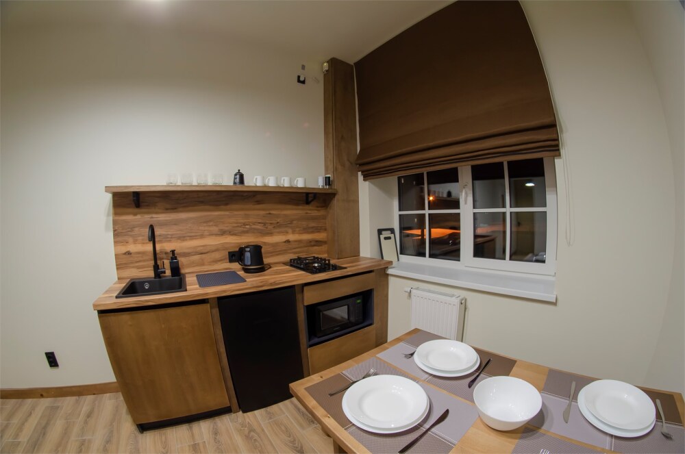 Номер очень уютный со своей обеденной зоной, кухней и спальней. Кухня оснащена микроволновой печью, холодильником, и чайником. Также здесь имеется полный комплект посуды для приготовления и приема пищи.