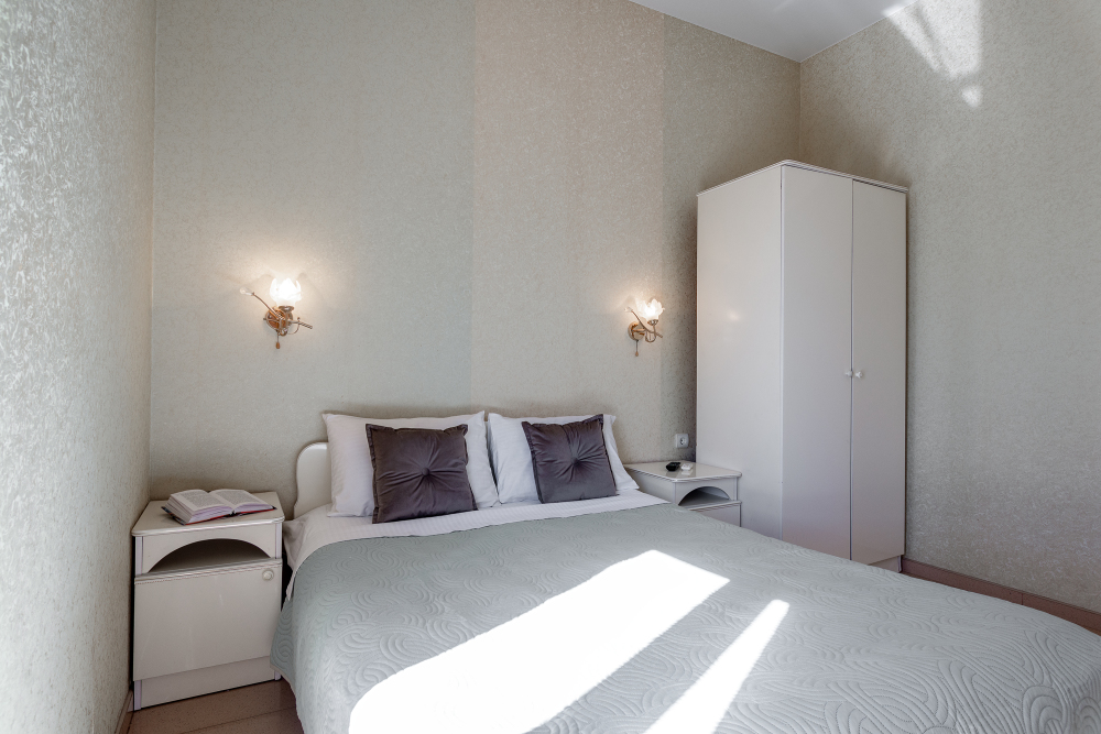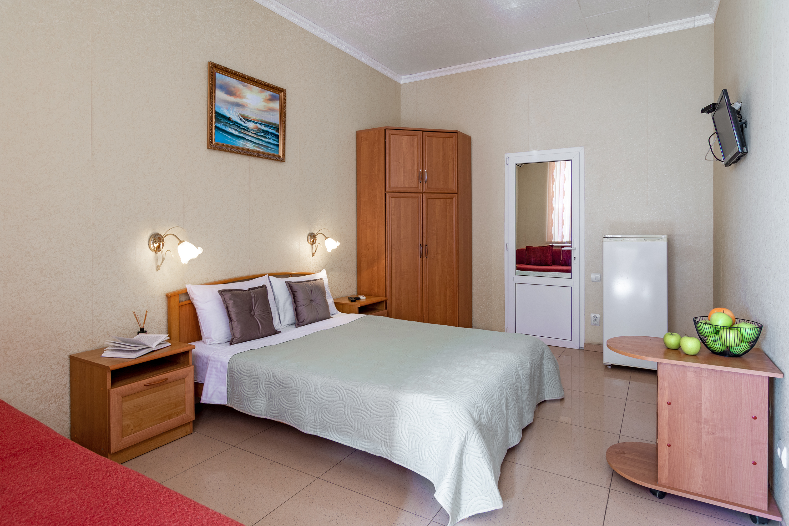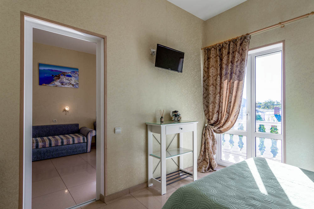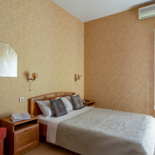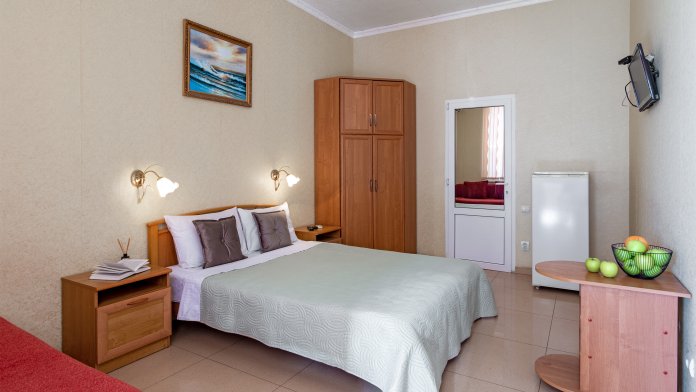 Четырёхместный номер, категории стандарт, двуспальная кровать, диван раскладывается, телевизор, холодильник, кондиционер, душ, туалет в номере.