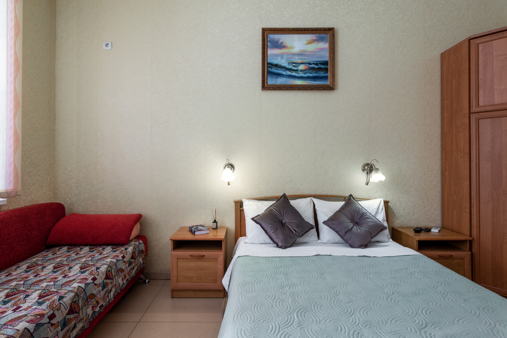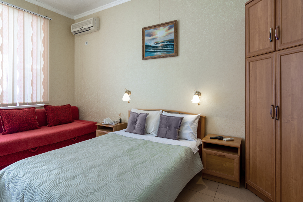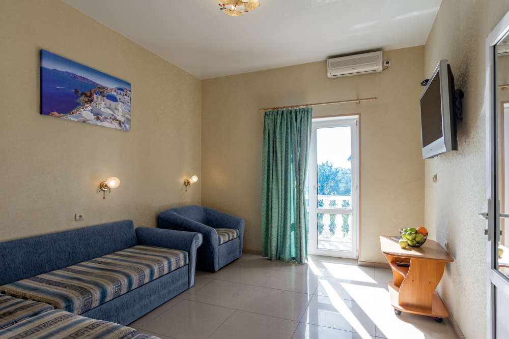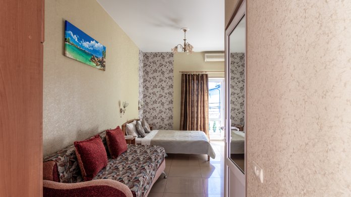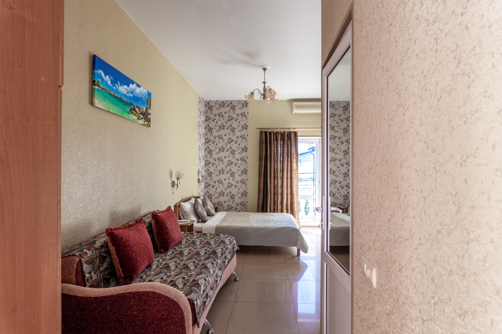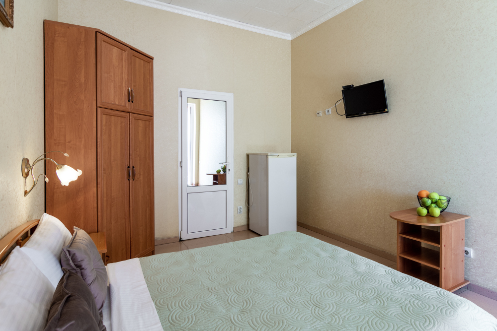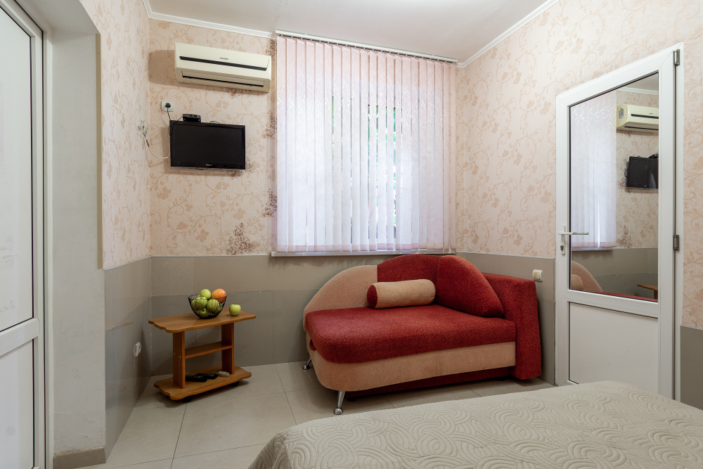 Трехместный номер категории стандарт, сплит-система, холодильник, телевизор, душ, туалет. Кровать двухспальная, диван.