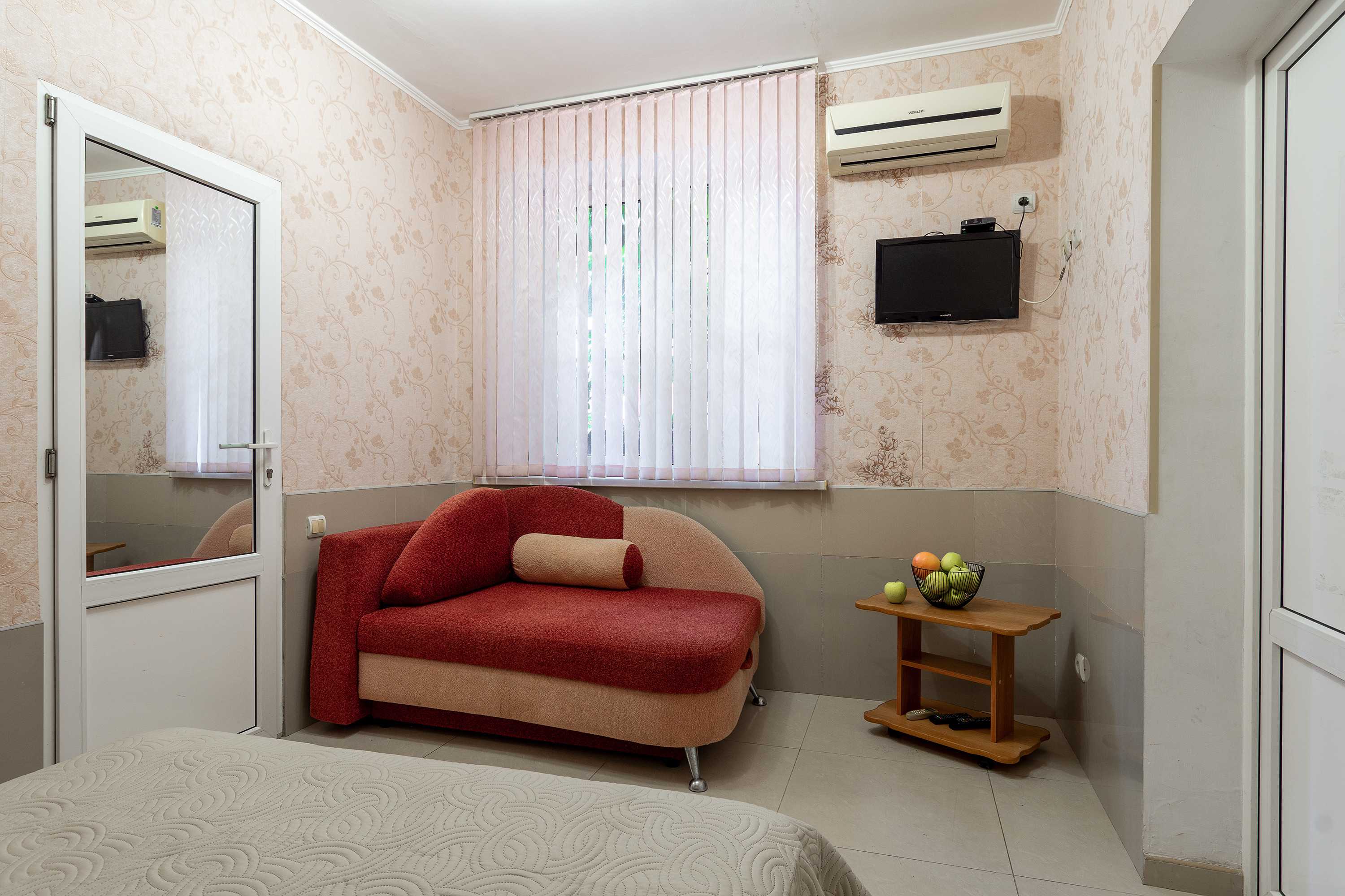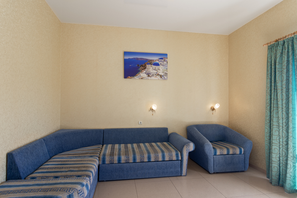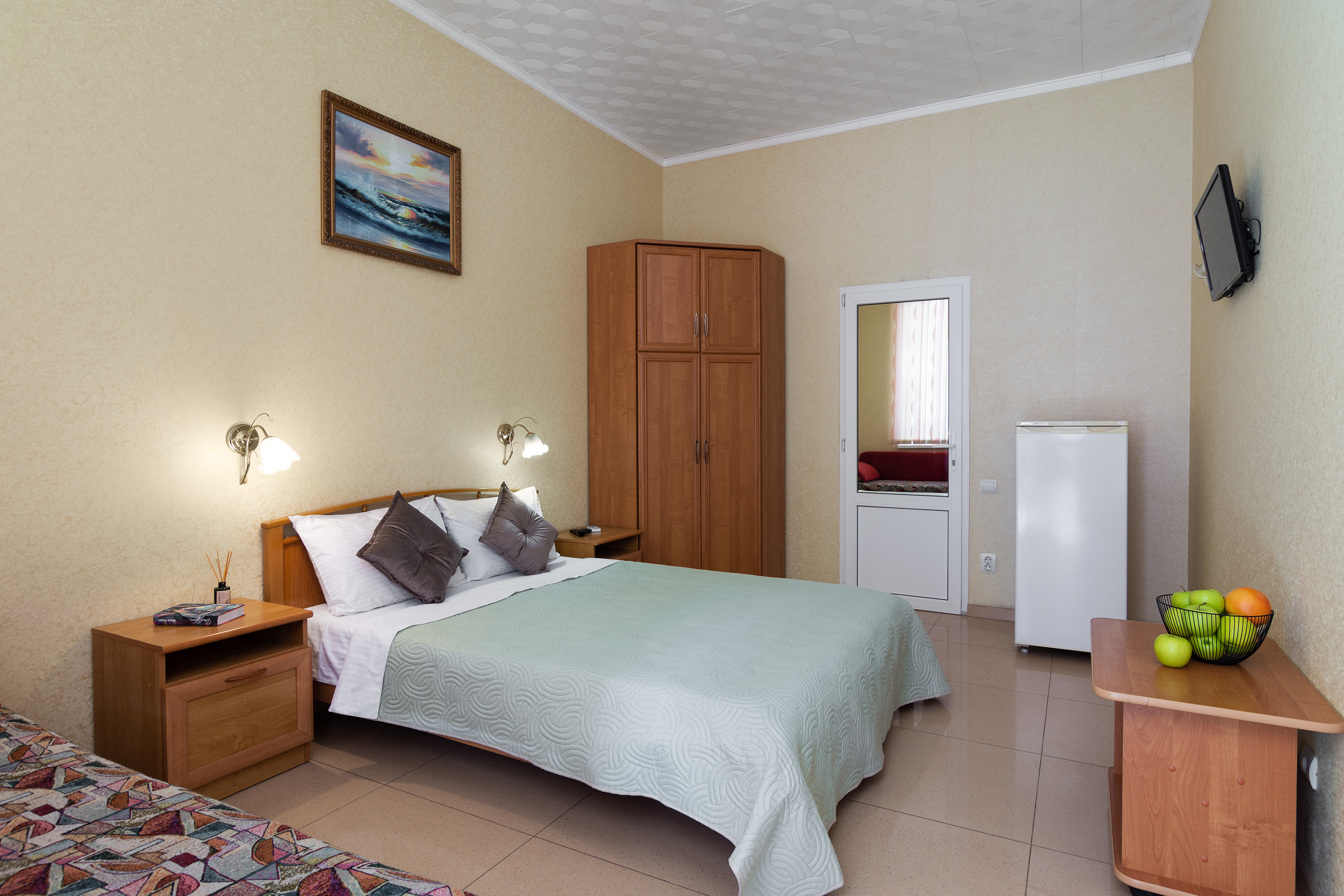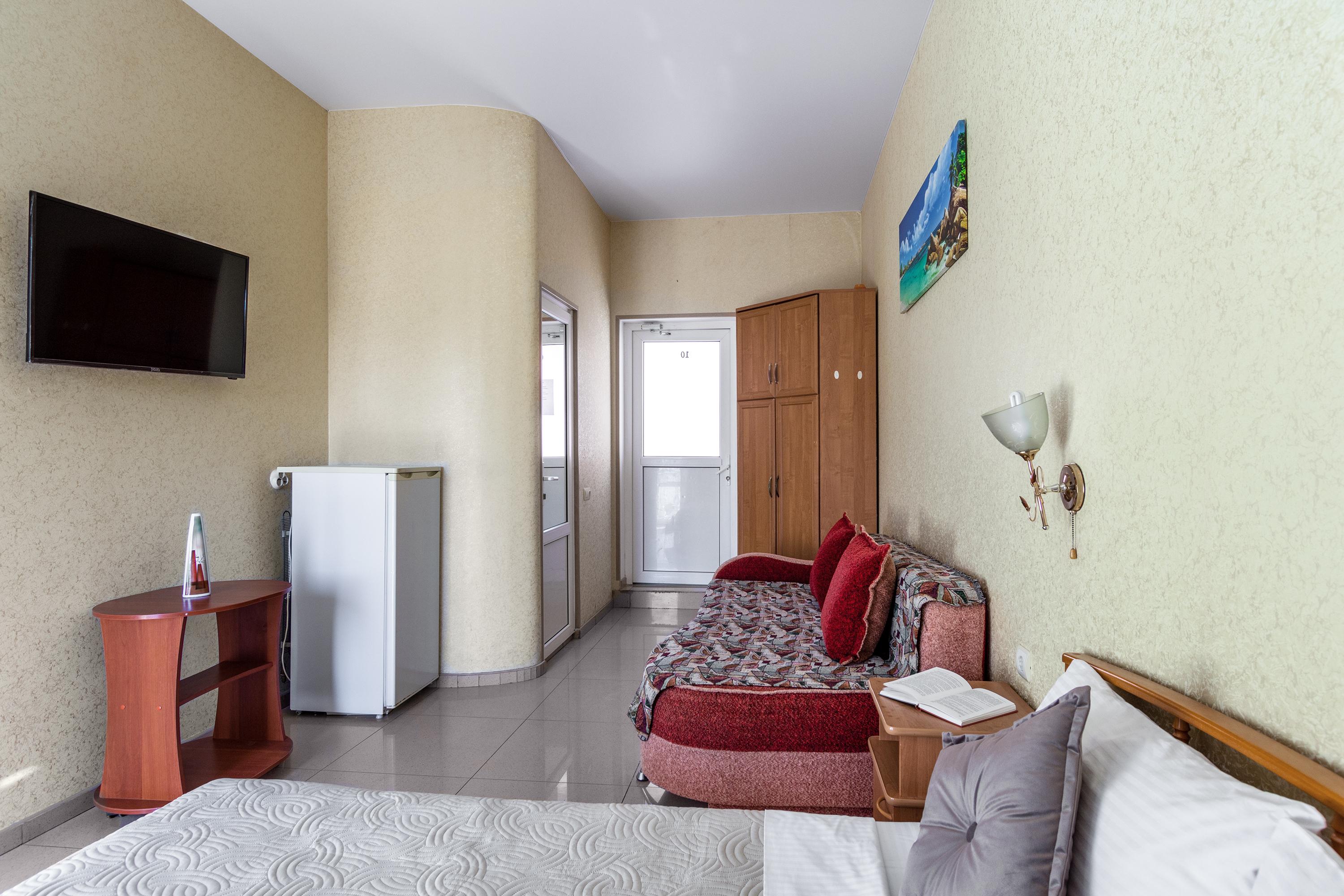 Трехместный номер категории стандарт, сплит-система, холодильник, телевизор, душ, туалет. Кровать двухспальная, диван.