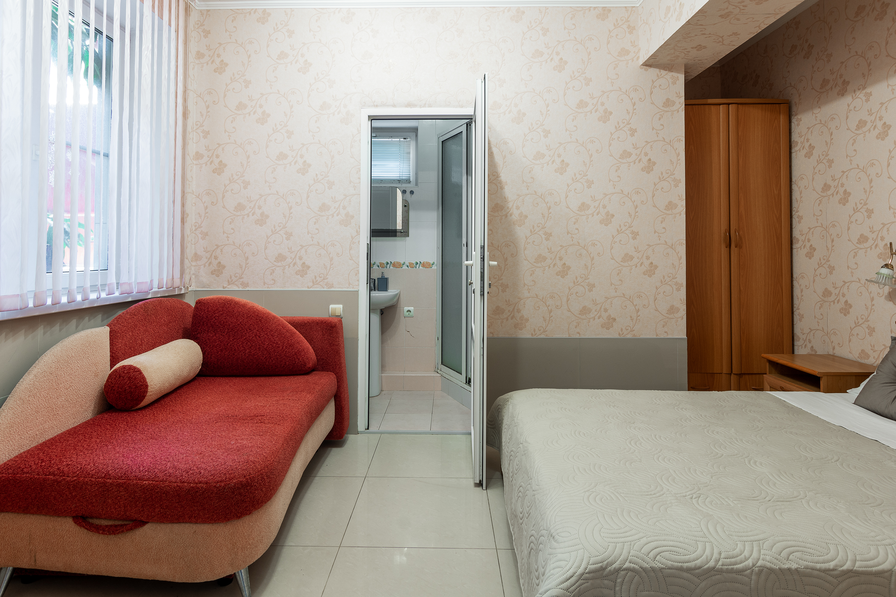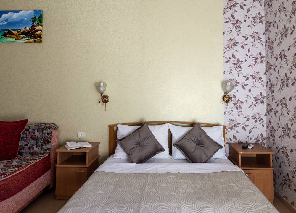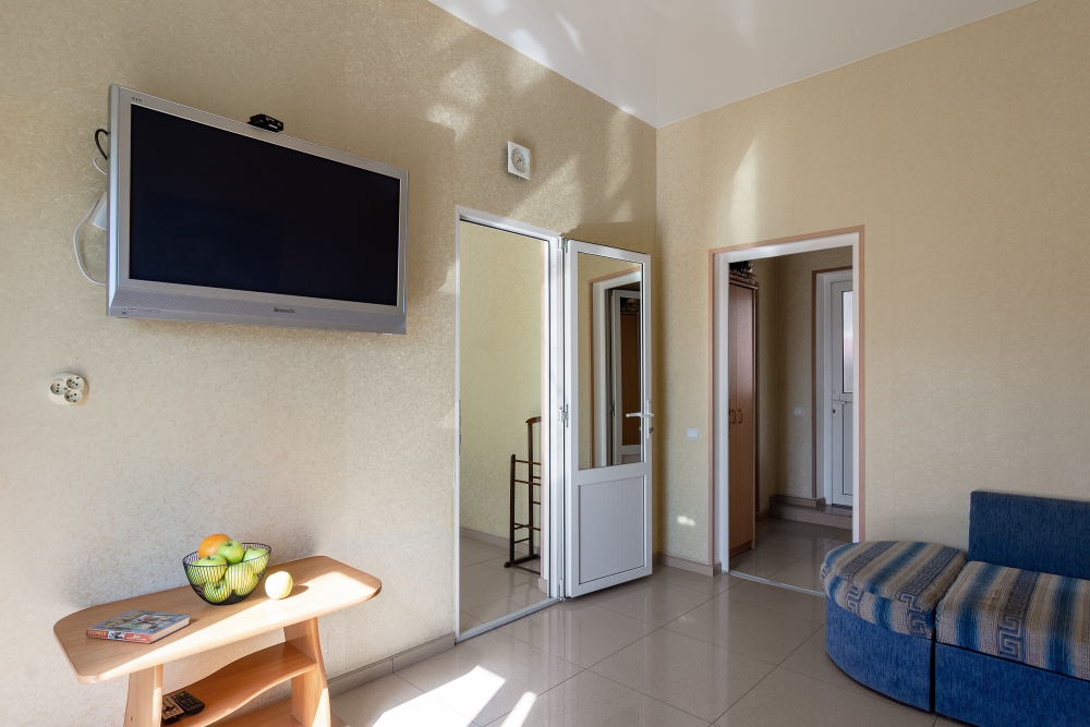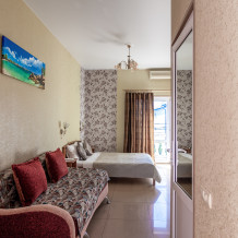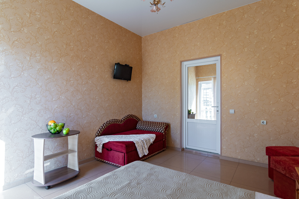 Трехместный номер категории стандарт, сплит-система, холодильник, телевизор, душ, туалет. Кровать двухспальная, диван. В вашем распоряжении кухня, стиральная машинка, гладильная доска. Работает Wi-Fi.