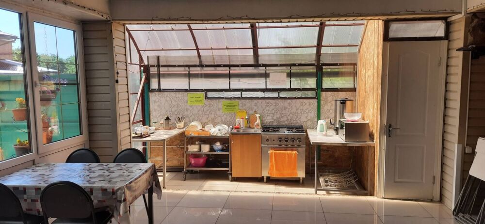 На территории есть оборудованная кухня для собственного приготовления (плита, микроволновая печь, посуда).