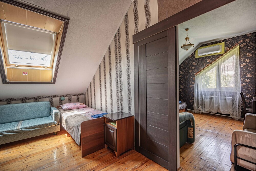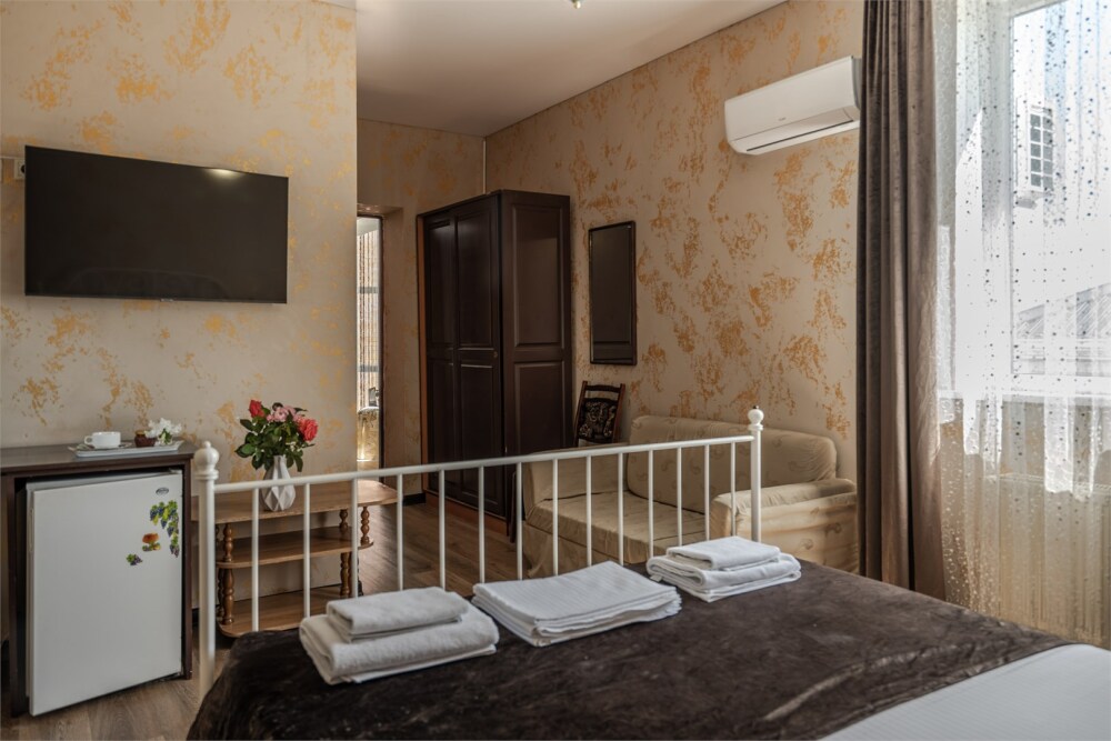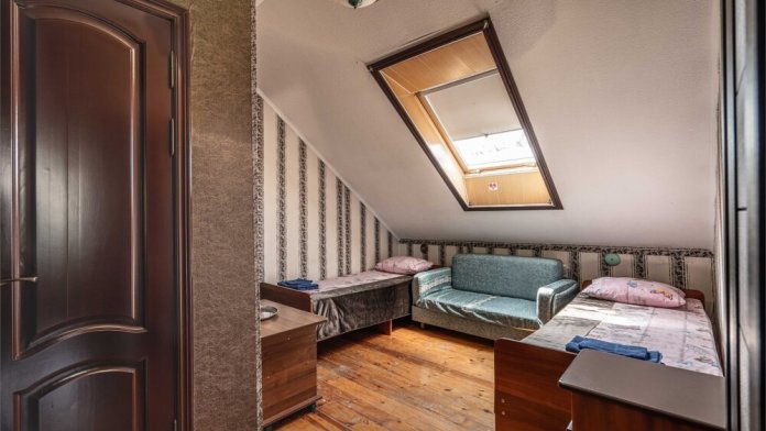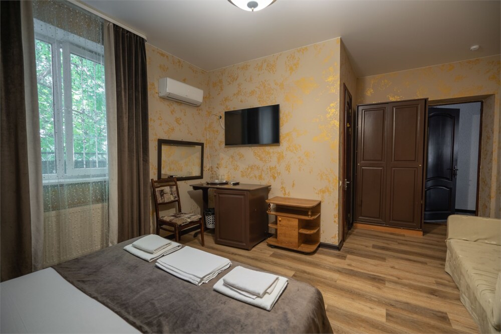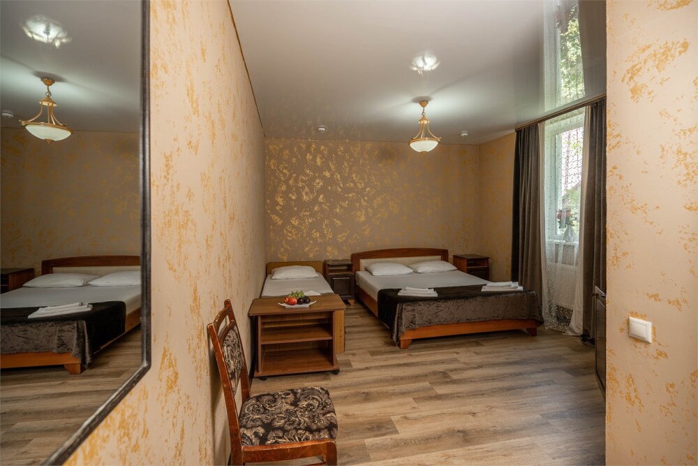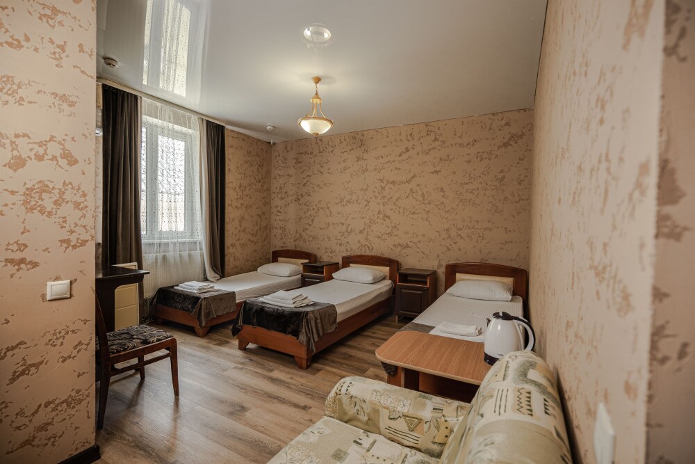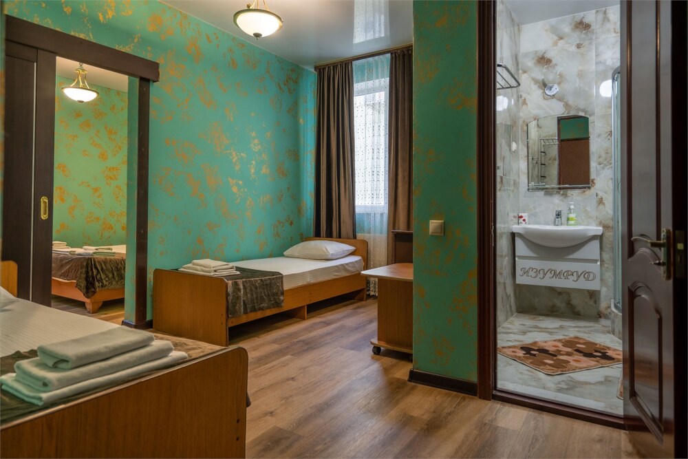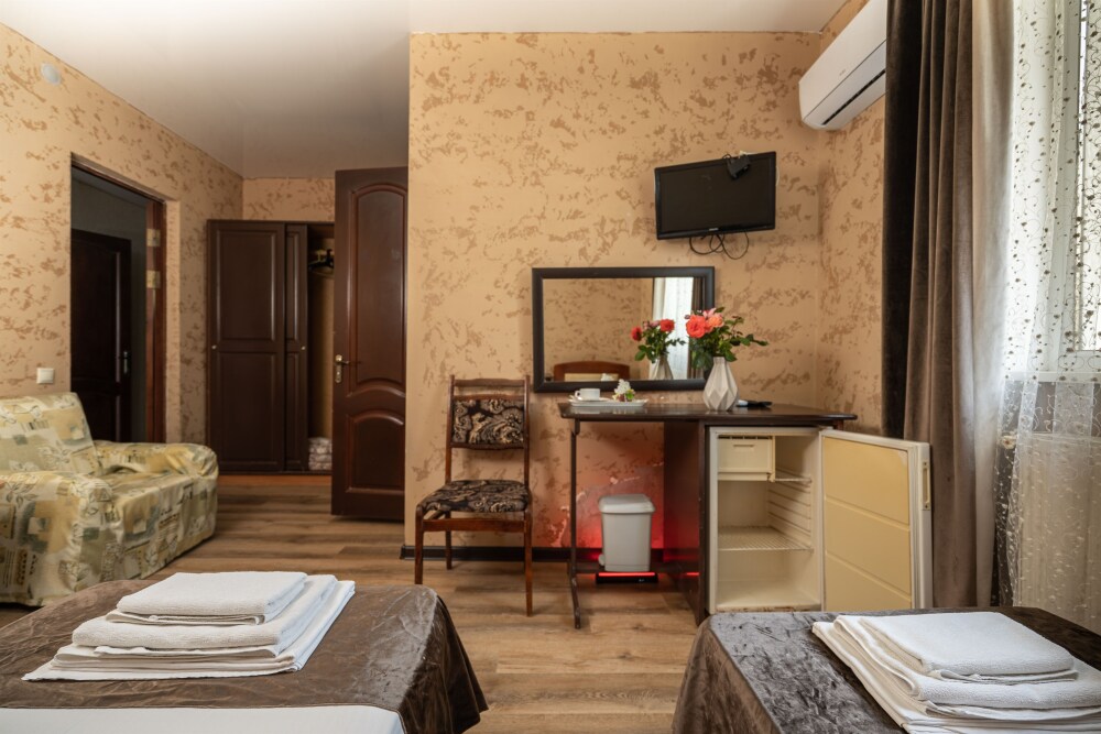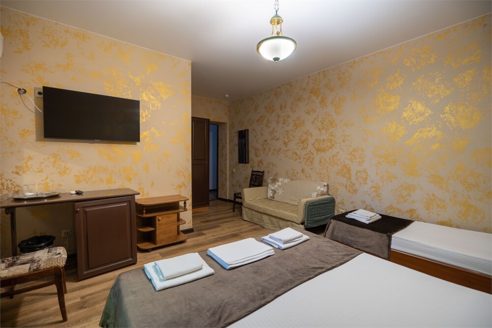 Номер с удобствами, двухкомнатный номер, двухспальная кровать и две односпальные.