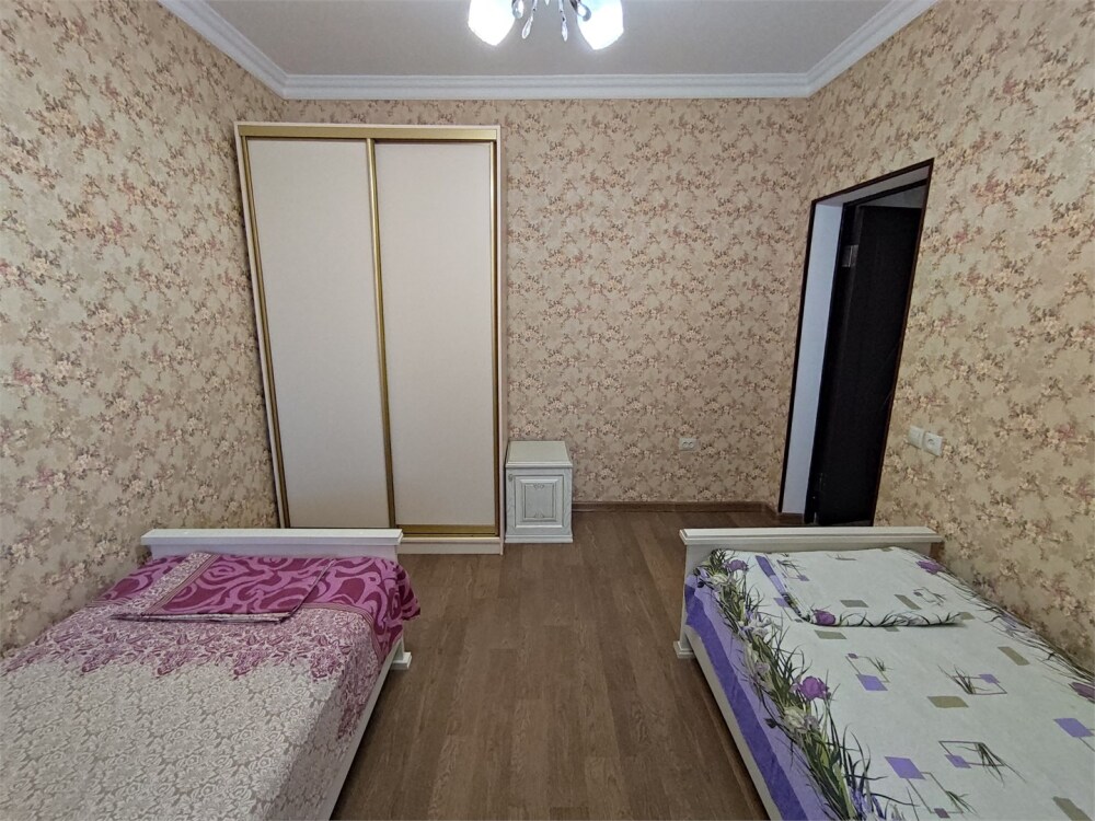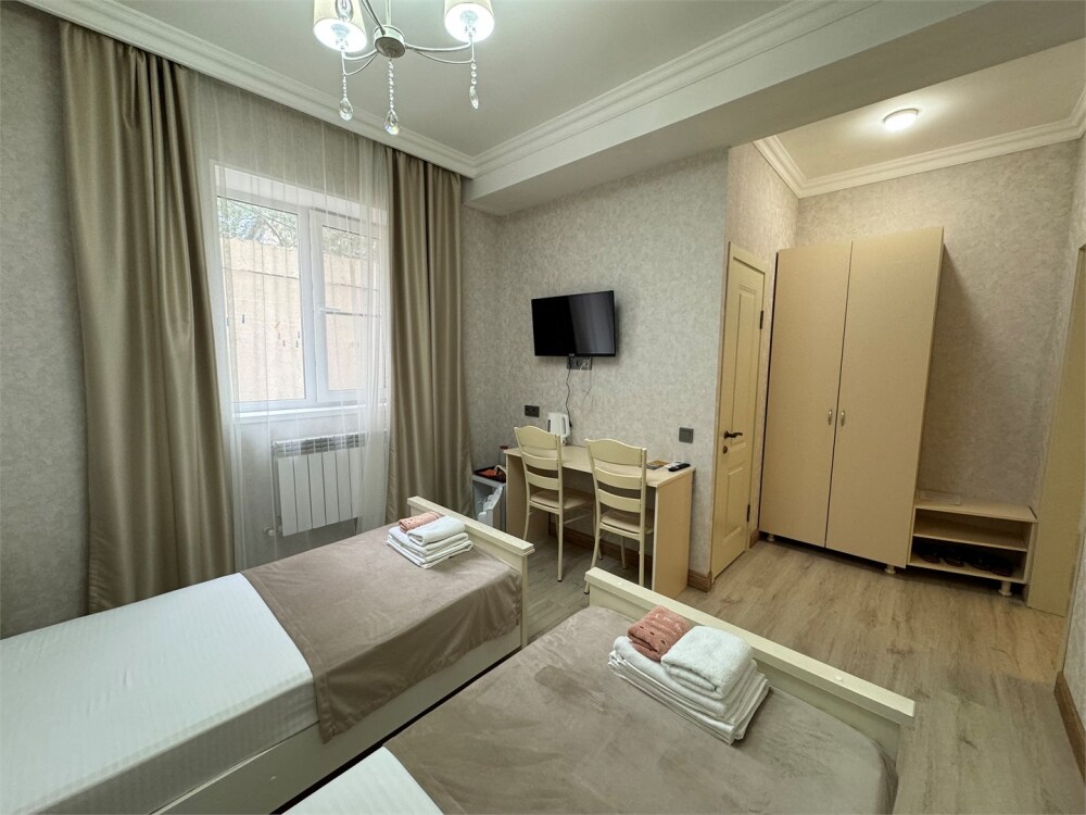 Две раздельные кровати, постельное бельё входит в стоимость. Санузел совмещенный и находится в номере. Также есть фен, полноценный шкаф для одежды.
