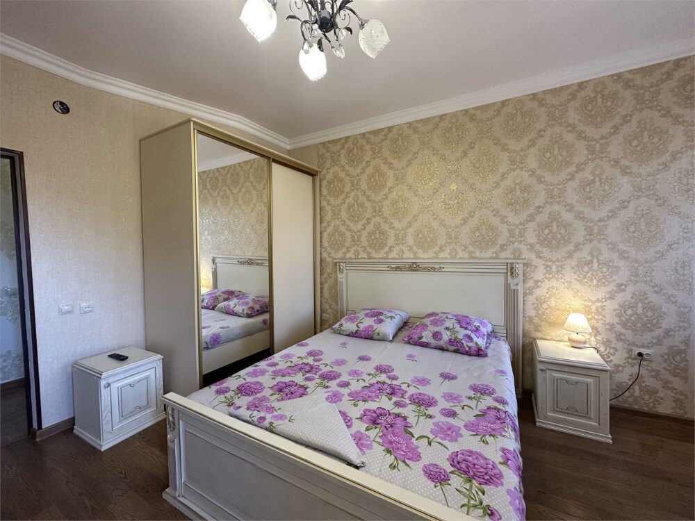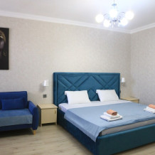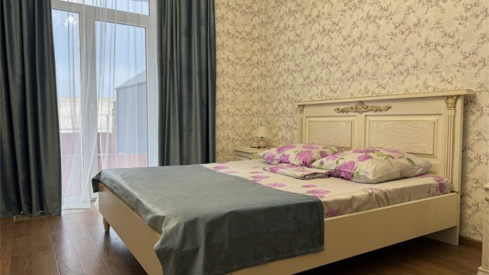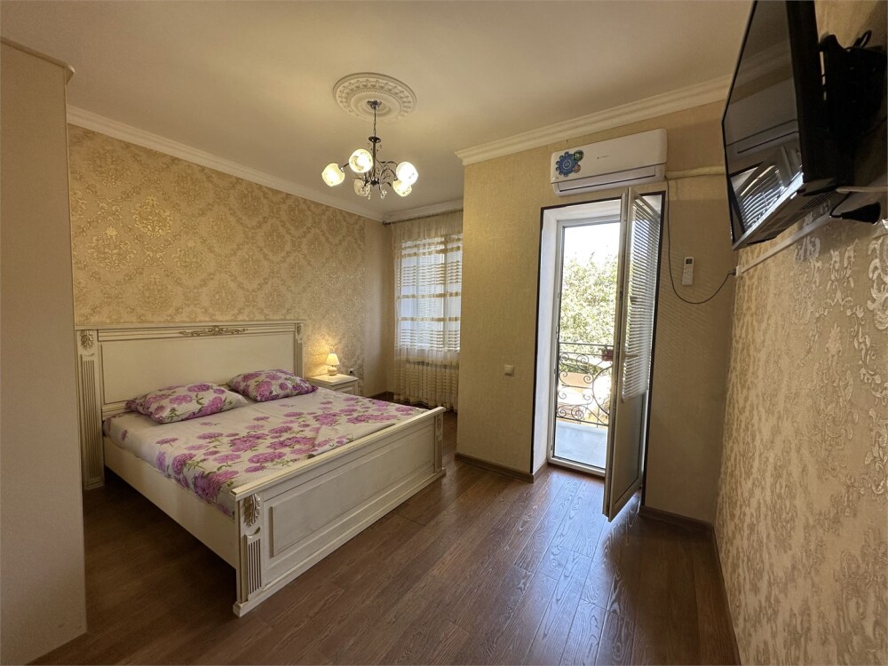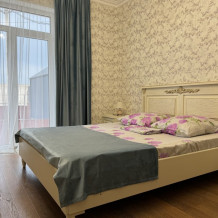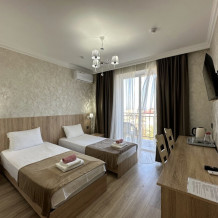 Двухкомнатный номер категории Люкс с балконом, откуда открывается частичный вид на море. Кровать в номере 2*2 и диван-кровать со спальным местом 1.8*1.9м. В номере 2 телевизора, беспроводной интернет, холодильник, обеденный стол, шкаф для одежды, электрический чайник и минимальный набор посуды. За климат отвечает сплит-система и система отопления.