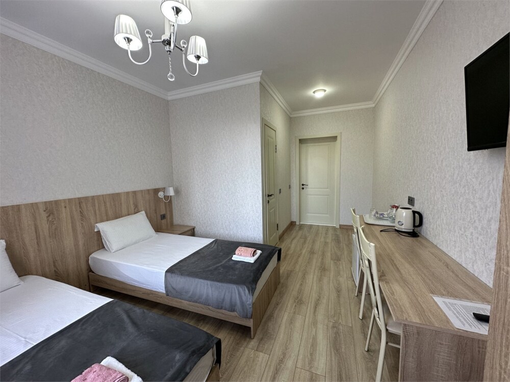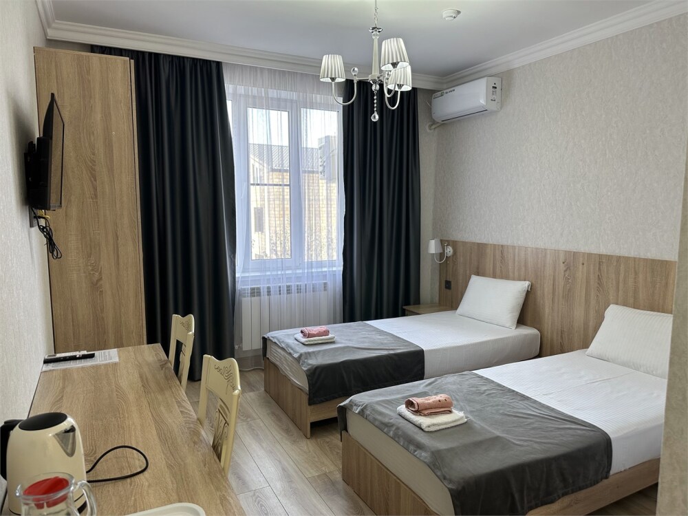 Стандартный номер на двоих с возможностью сдвинуть кровати. В номере есть всё необходимое: постельное бельё, полотенца, фен, электрочайник, телевизор и беспроводной интернет.