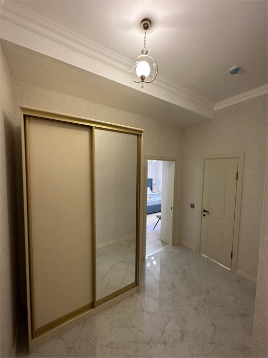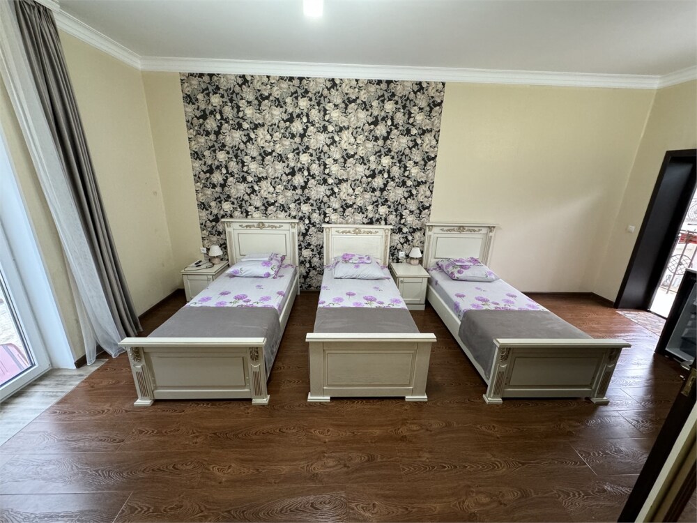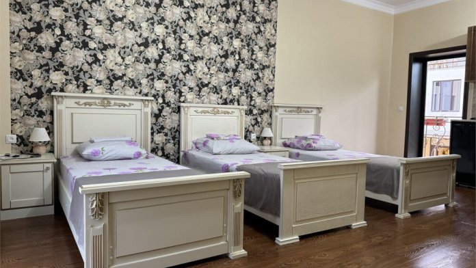 Номер с прихожей и большой комнатой. В номере есть межкомнатная дверь, разделяющая спальную зону и прихожую, своя ванная и туалет. Имеется ванна с душем, полотенцесушитель, фен, полноценный шкаф для одежды и обуви. Основное спальное место - кровать 2*2, дополнительно есть диван-кровать со спальным местом 1*4*1.9. В комнате большой smart-телевизор, беспроводной интернет, электрический чайник, чайный столик и минимальный набор посуды.