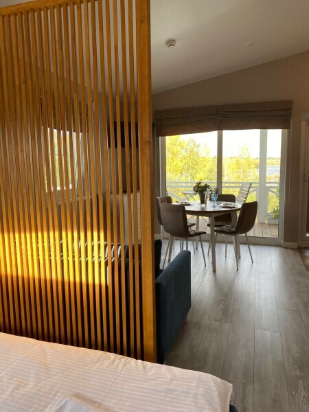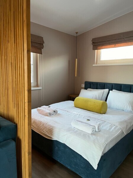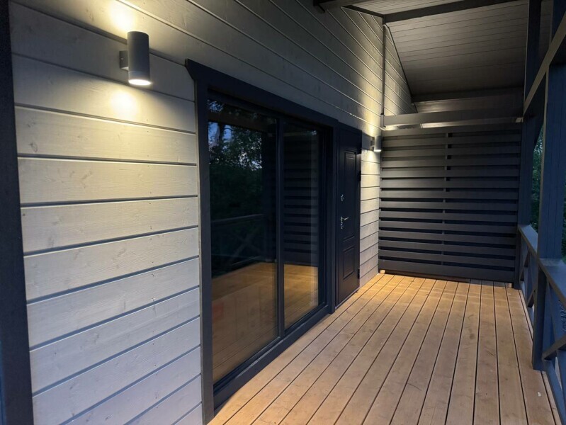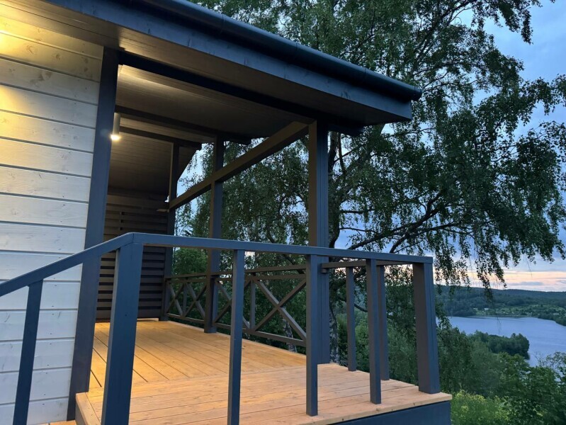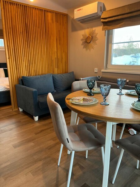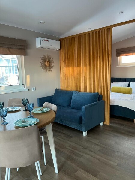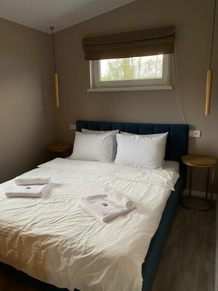 Для размещения гостям предлагают уютные дома площадью 31м2 с двуспальной кроватью и дополнительными местами на диване для до 4-х человек. Кухня с бытовой техникой, ванная с душевой кабиной и стиральной машиной. Панорамные окна с видом на озеро и терраса для отдыха на свежем воздухе. В каждом доме есть дополнительная система звукоизоляции.