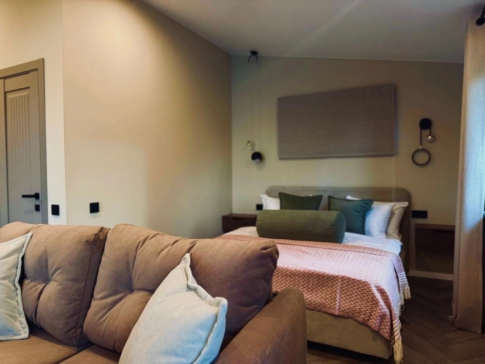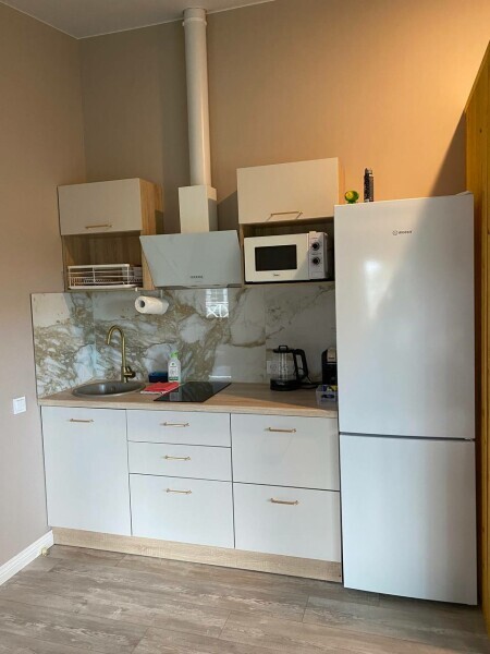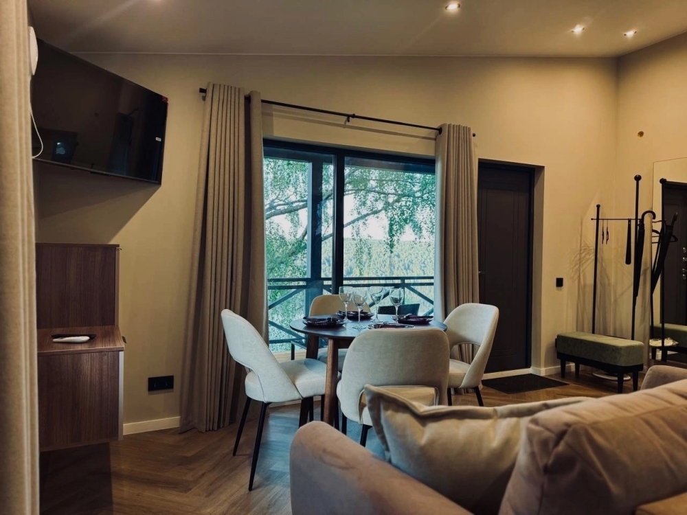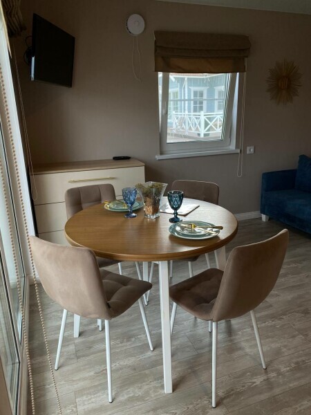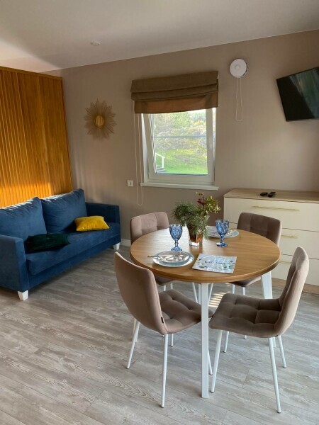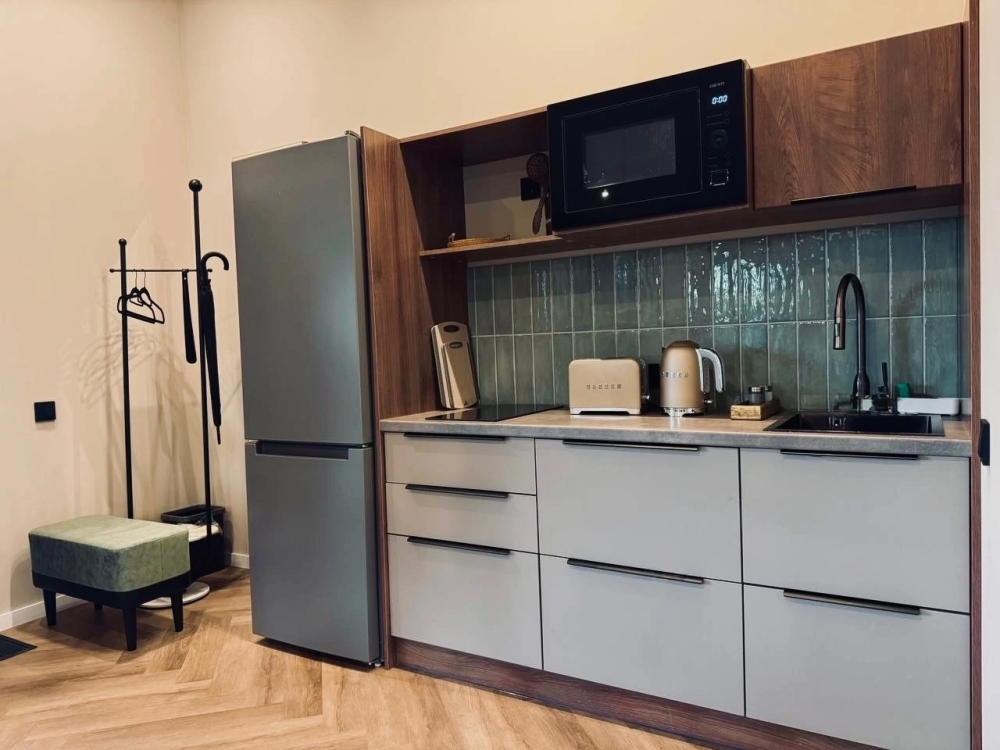 Что внутри: 1 спальня, гостиная. Кухня со всем необходимым: посуда, приборы, кухонные принадлежности (кастрюли, сковороды, дуршлаг, тёрка, доски, ножи и др.), электрический чайник, капсульная кофемашина, варочная панель, холодильник с морозильной камерой, чай, кофе, сахар.