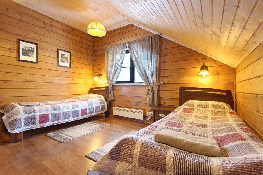 В большой светлой комнате с мягкими креслами и телевизором стоят две односпальных кровати и большой раскладной диван. В отдельной комнате со своей дверью в уютной нише расположилась большая двуспальная кровать для пары.