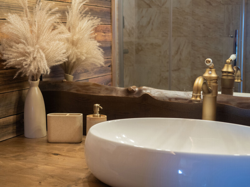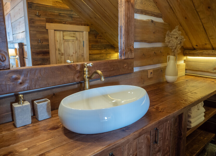 Большой современный санузел в стиле Альпийского шале никого не оставит равнодушным.