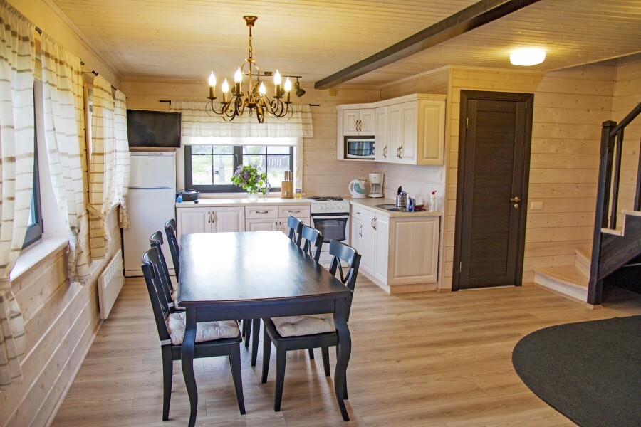 Современный уютный интерьер, европейский комфорт, мебель из натурального дерева, теплые пастельные тона – все это радует глаз и душу. Мангальный домик, причал с лодками, банный комплекс в двух шагах – здесь есть все для незабываемого отдыха и отличной рыбалки.
