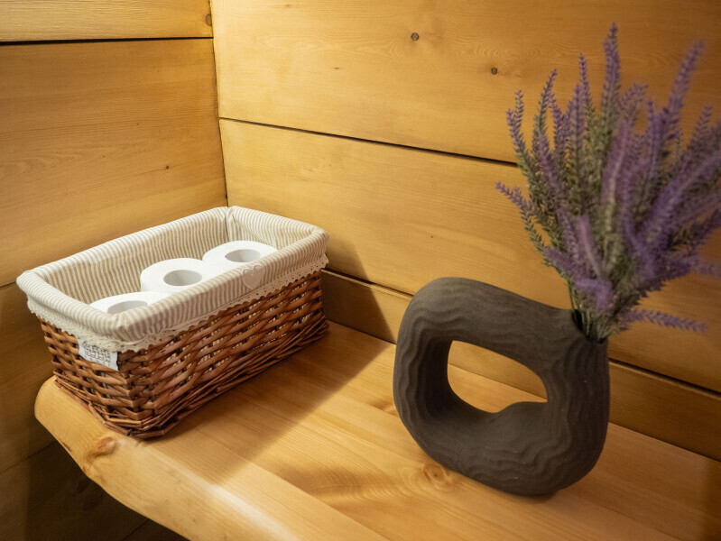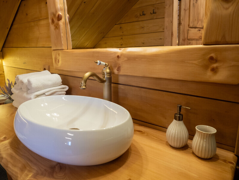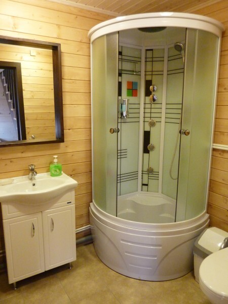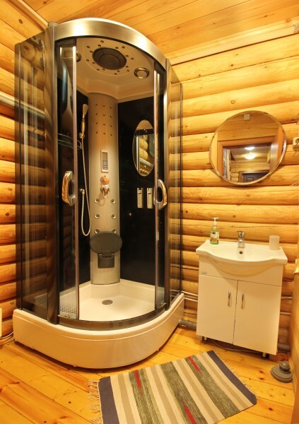 Современный стильный санузел с тёплым полом имеет большую душевую с тропическим душем. В полностью натуральной деревянной комнате легко дышится благодаря уникальной системе вентиляции. Через окно, выходящее на север можно любоваться летними закатами, а зимой только из этой комнаты можно увидеть северное сияние!