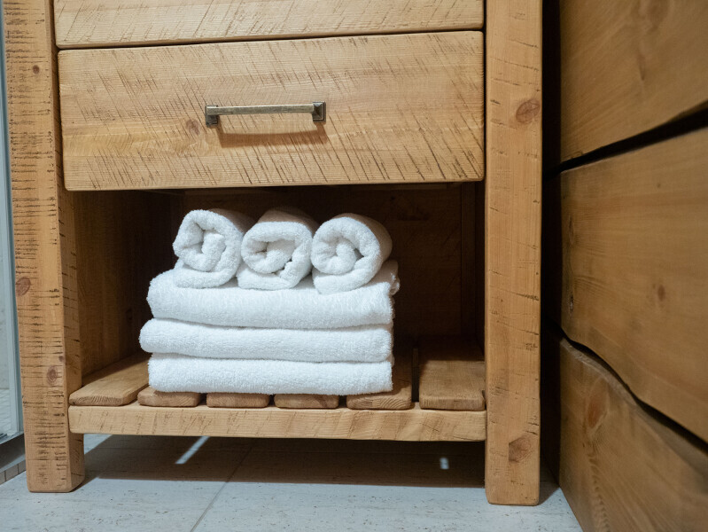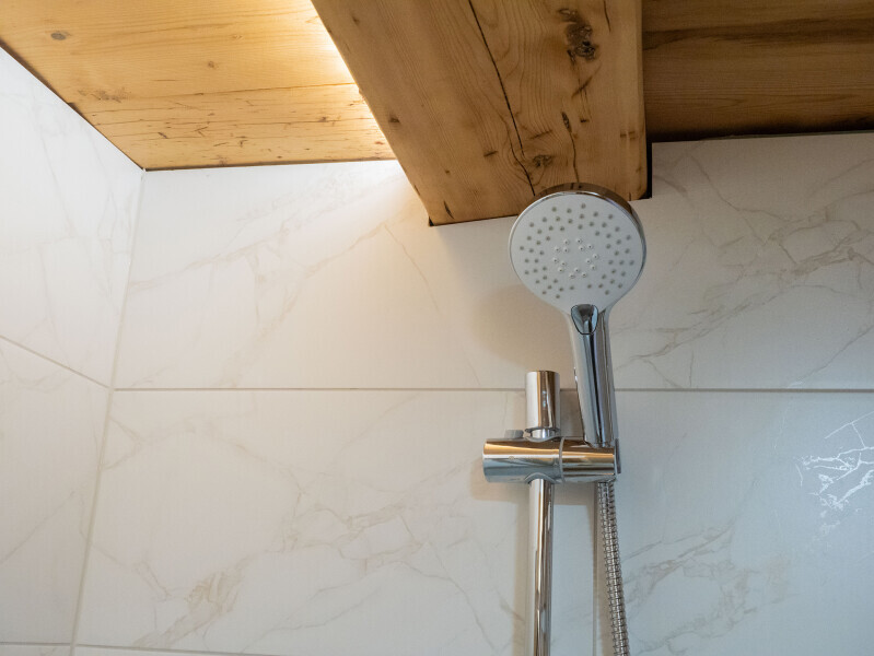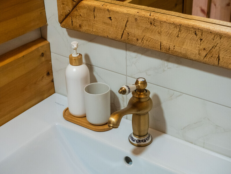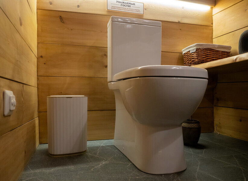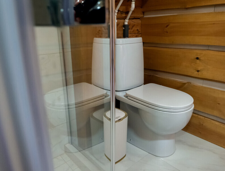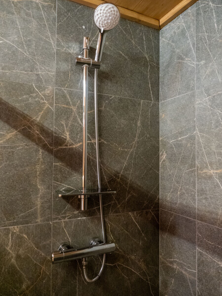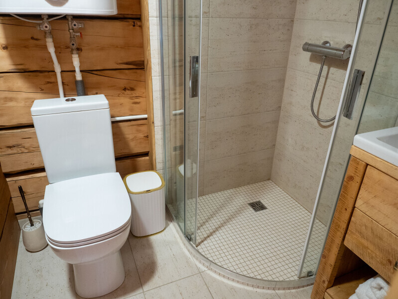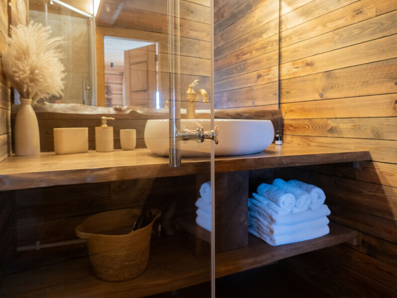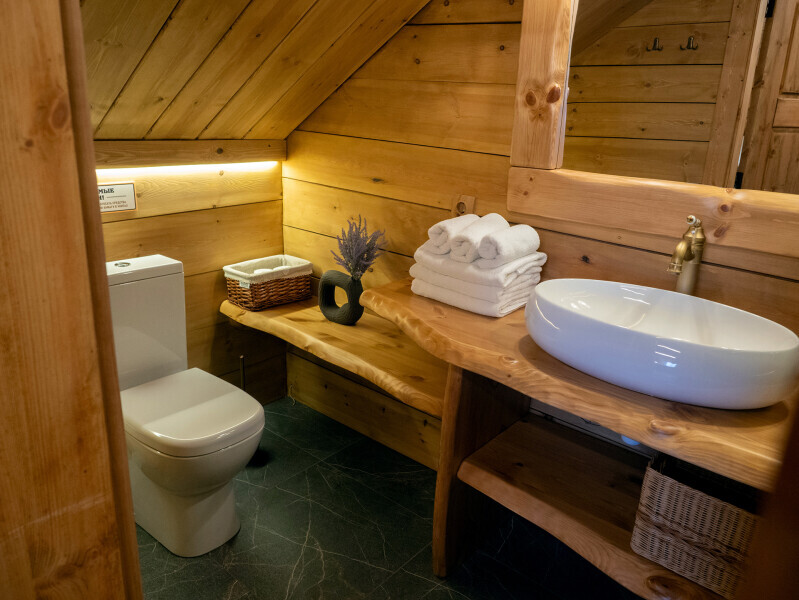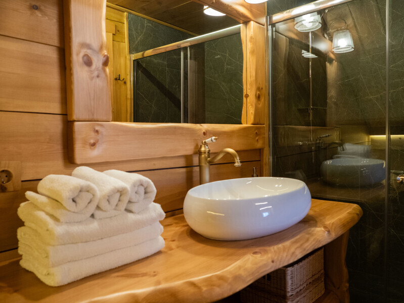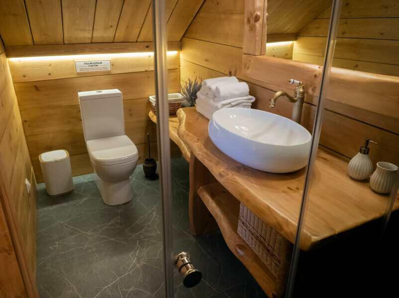 Современный стильный санузел с тёплым полом имеет большую душевую с тропическим душем. В полностью натуральной деревянной комнате легко дышится благодаря уникальной системе вентиляции.