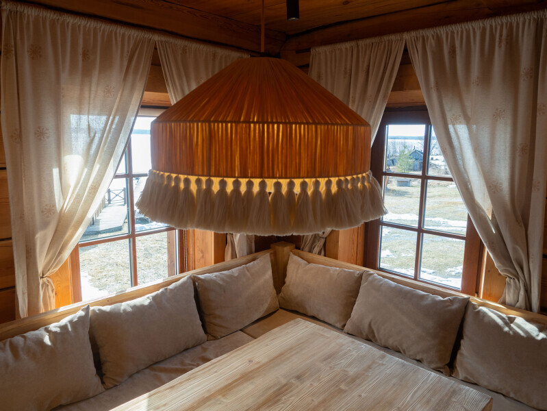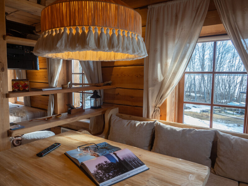 Панорамные окна комнат, выходят на озеро и внутренний двор, а в период белых Карельских ночей закрываются шторами блэкаут.