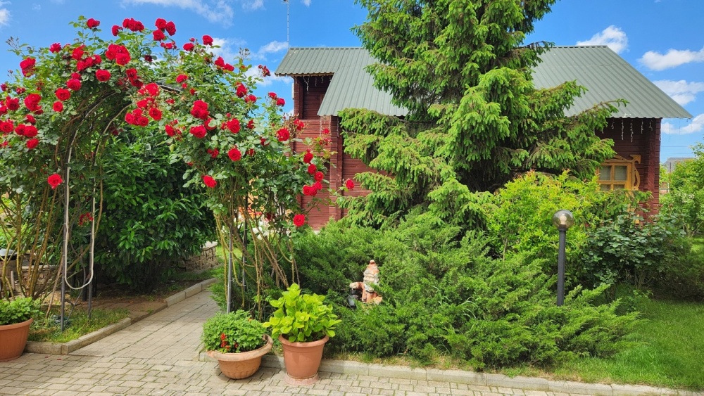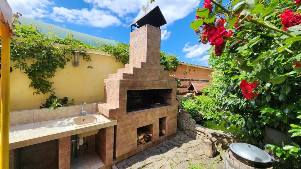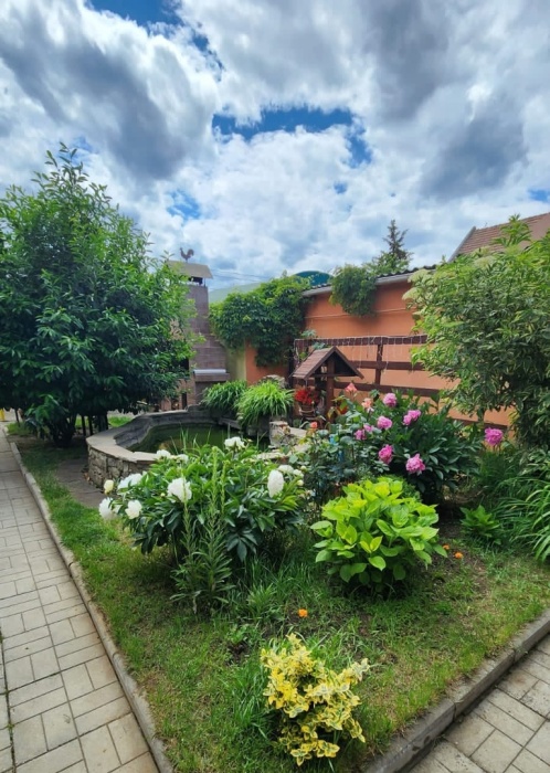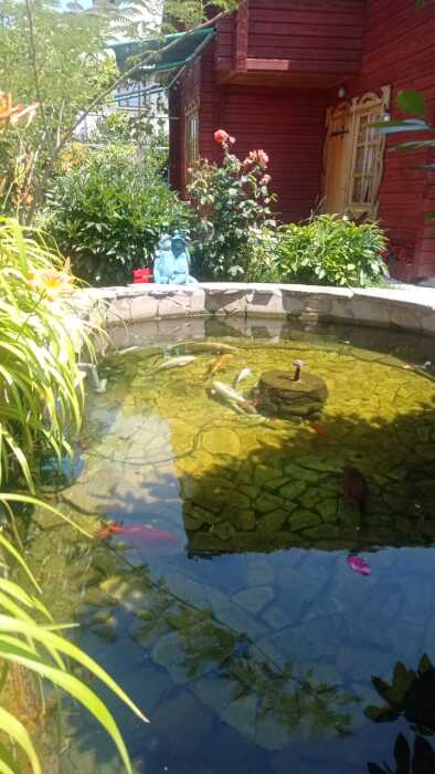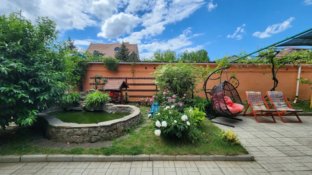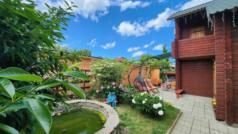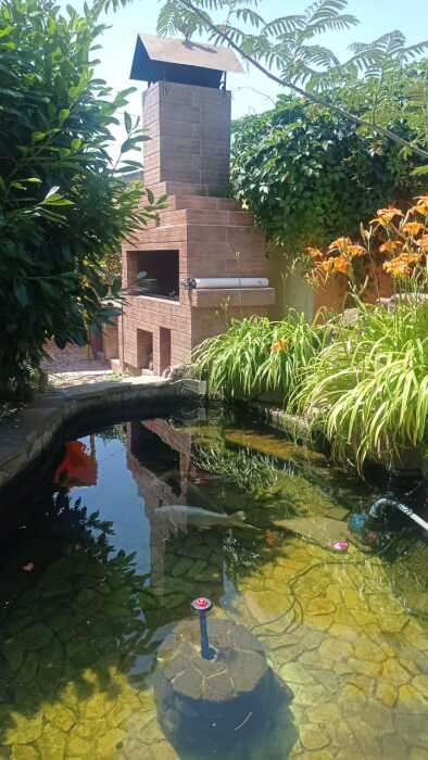 Во дворе детский городок с домиком, место для стоянки машины, мангал с коптильней, пруд с фонтаном, водопадом и рыбками, площадка для отдыха.