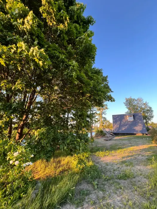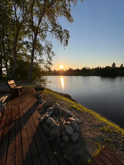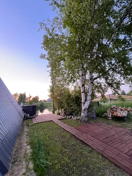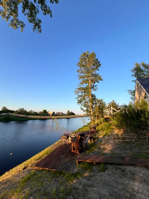 Рядом с домом мангал (шампуры и решетки есть), костровое место, большая терраса 30 кв.м. с видом на р. Олонка.