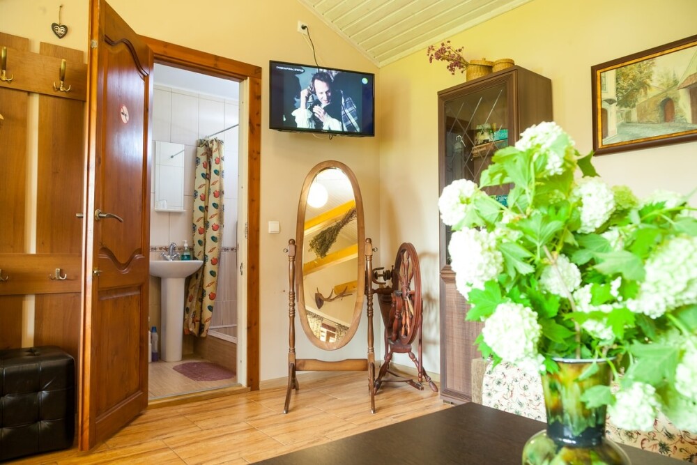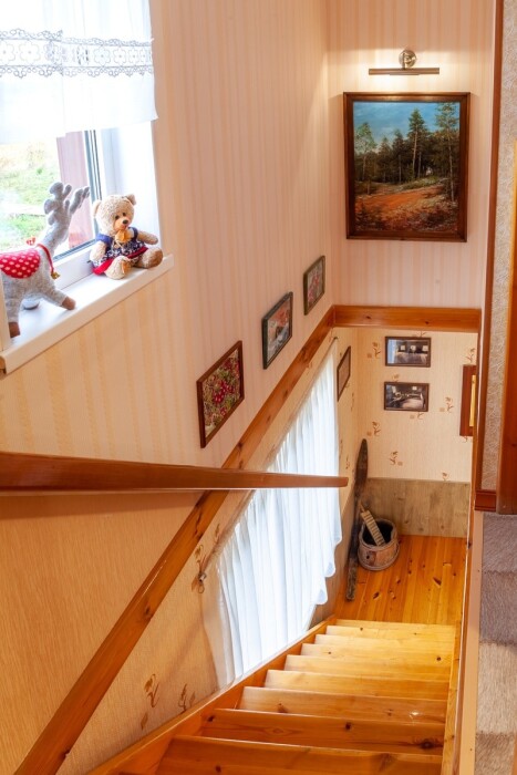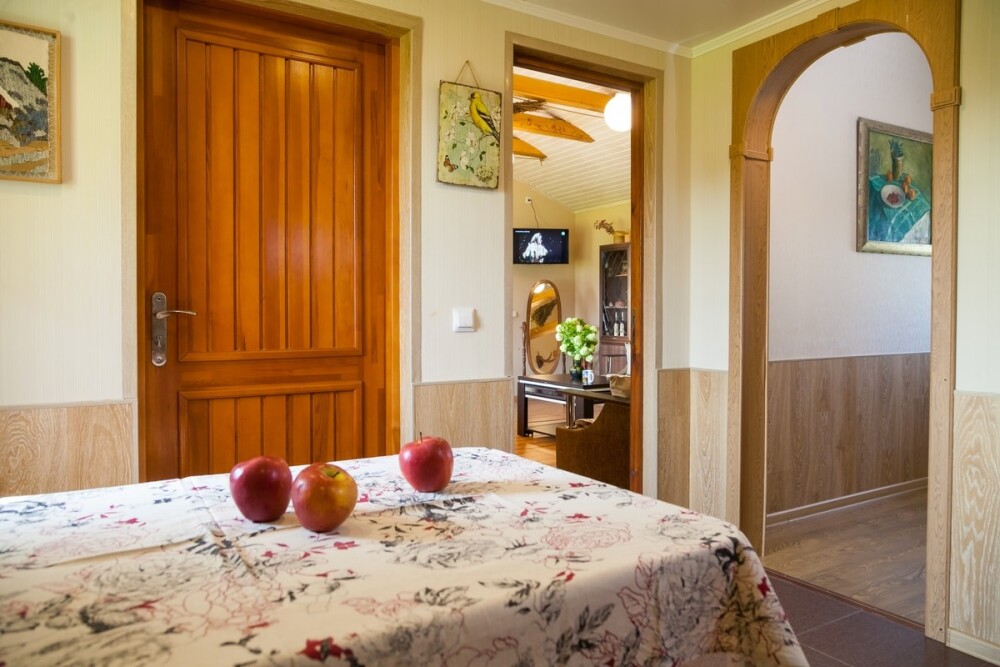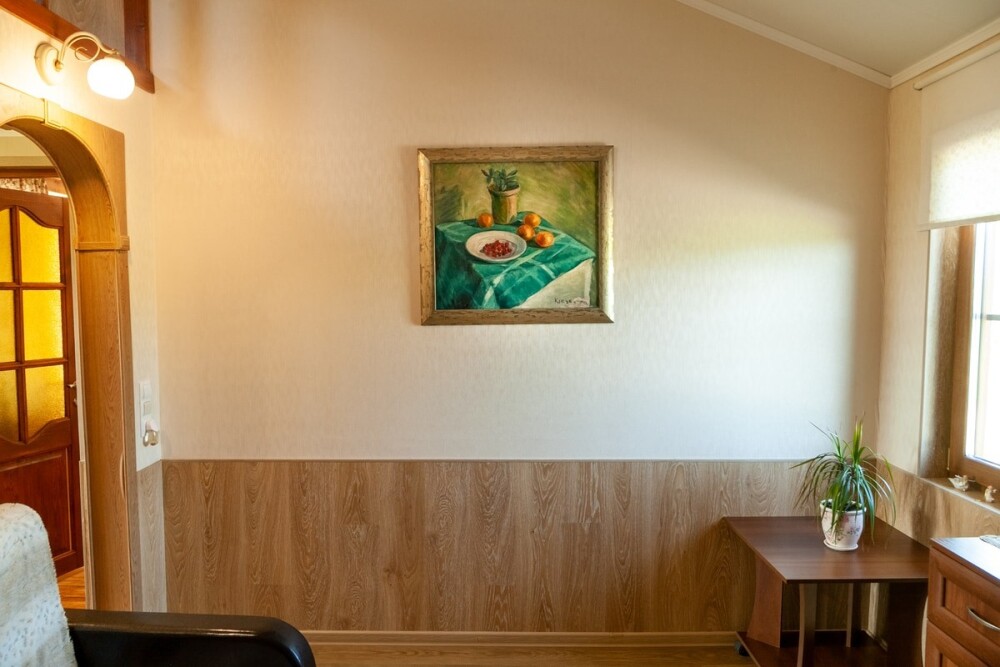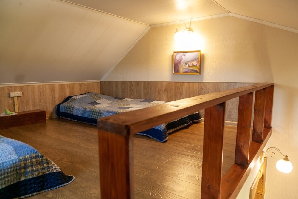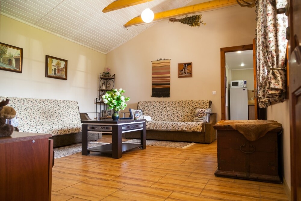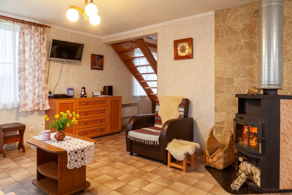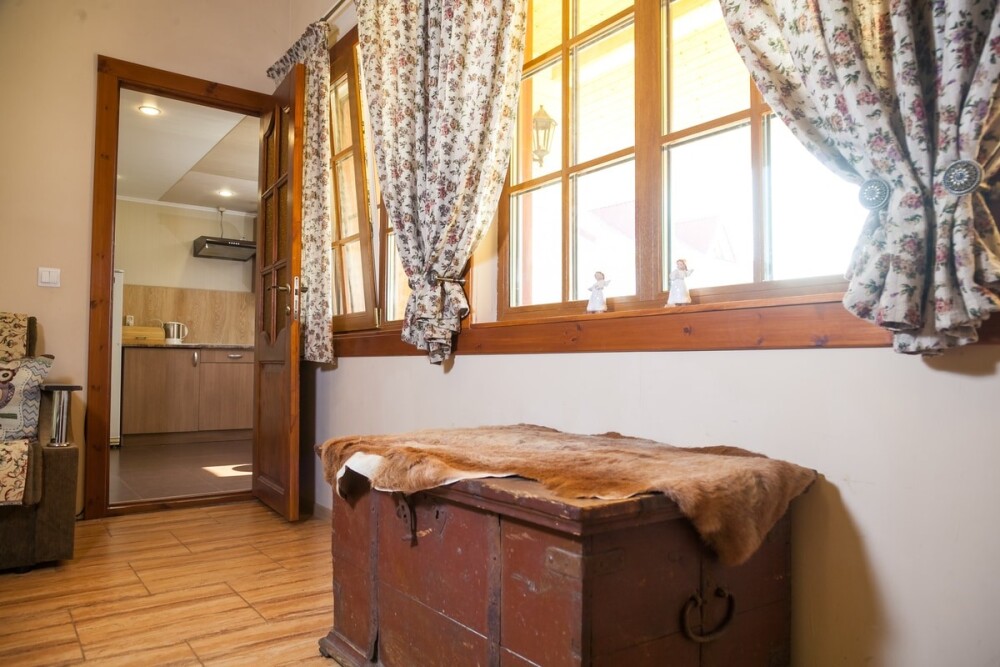 Холл с большими окнами и высокими потолками с балками. В этой же комнате 2 раскладных дивана (для комфортного сна предоставим доп. наматрасники), журнальный стол (раскладывается), телевизор, зеркало, старинный сундук, шкаф с сувенирами и зона прихожей. Через дверь - кухня с полным набором посуды, электрическая варочная панель; далее - маленькая комната с диванчиком (раскладывается) и телевизором, из этой комнаты лестница ведёт в спальню с 2 основными местами. В доме санузел, горячая вода. Отопление - электрические тёплые полы (кафель, ламинат). Зимой тепло.
