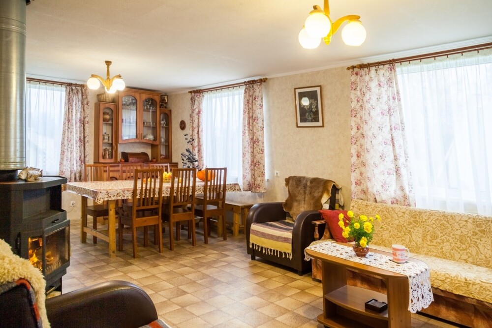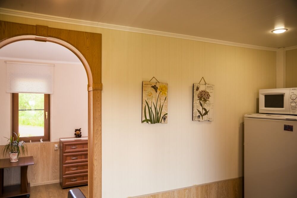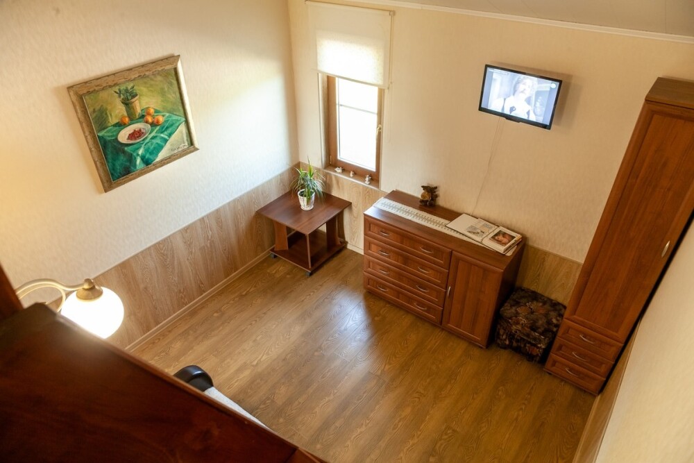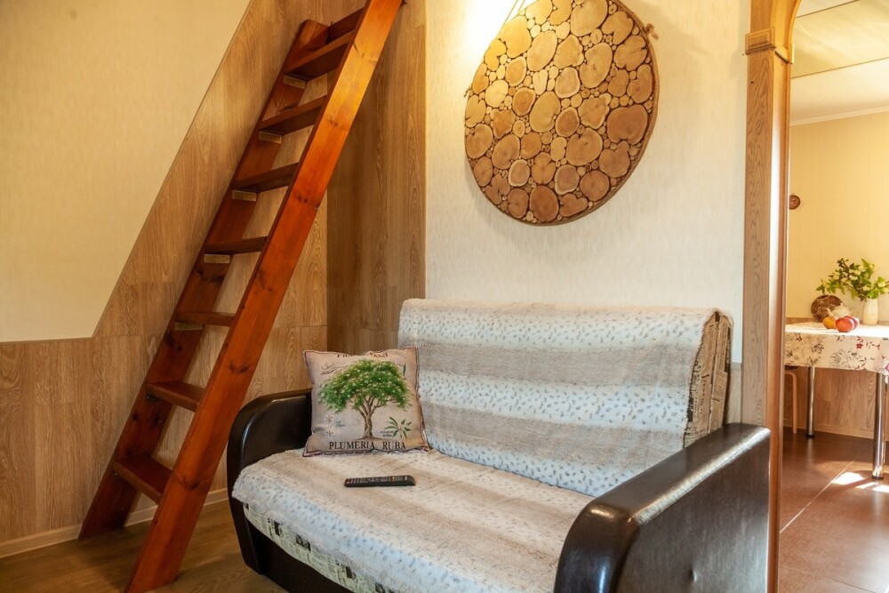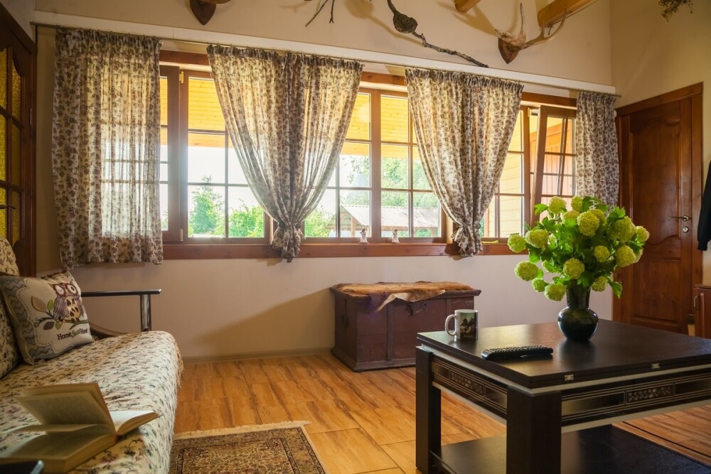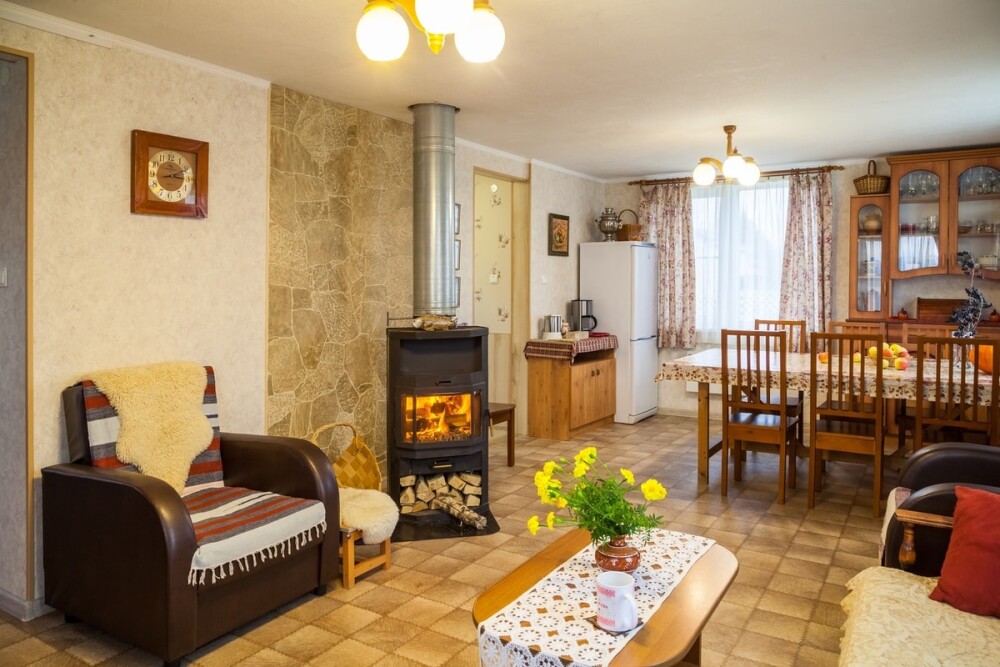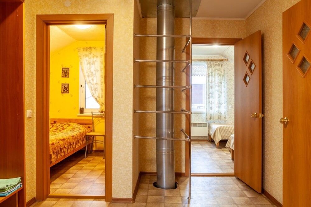 Холл с большими окнами и высокими потолками с балками. В этой же комнате 2 раскладных дивана (для комфортного сна предоставим доп. наматрасники), журнальный стол (раскладывается), телевизор, зеркало, старинный сундук, шкаф с сувенирами и зона прихожей. Через дверь - кухня с полным набором посуды, электрическая варочная панель; далее - маленькая комната с диванчиком (раскладывается) и телевизором, из этой комнаты лестница ведёт в спальню с 2 основными местами. В доме санузел, горячая вода. Отопление - электрические тёплые полы (кафель, ламинат). Зимой тепло.