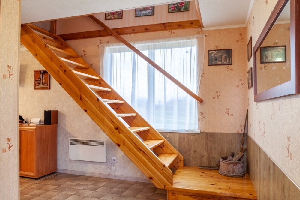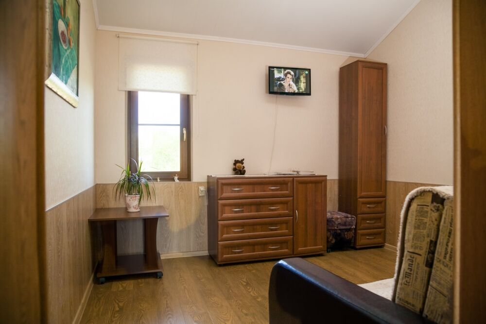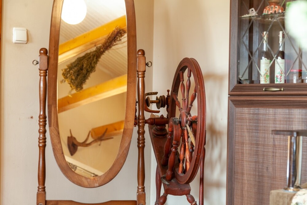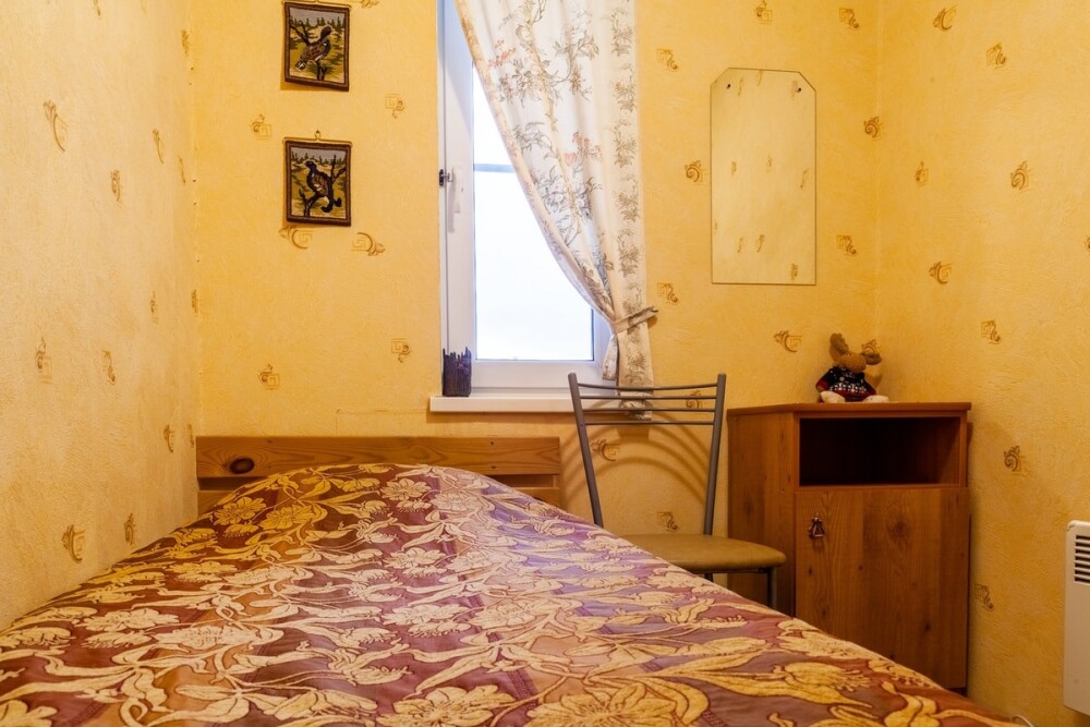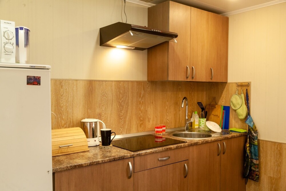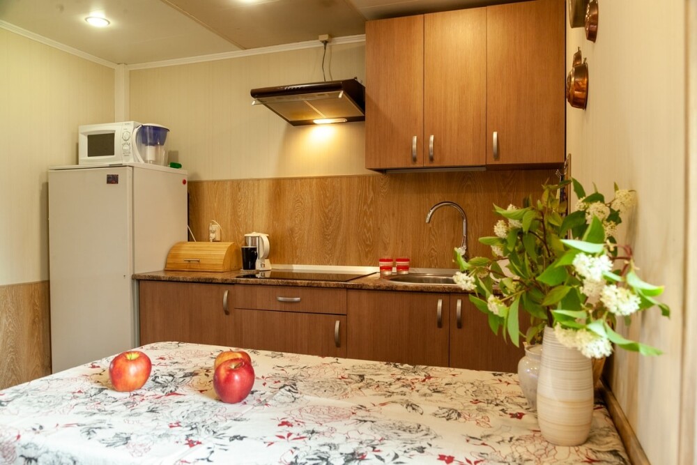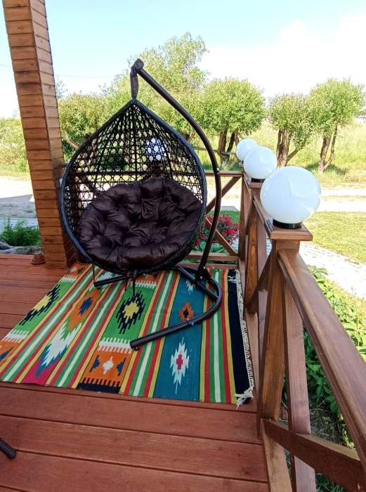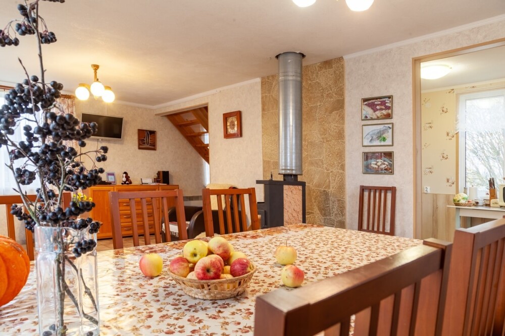 Холл с большими окнами и высокими потолками с балками. В этой же комнате 2 раскладных дивана (для комфортного сна предоставим доп. наматрасники), журнальный стол (раскладывается), телевизор, зеркало, старинный сундук, шкаф с сувенирами и зона прихожей. Через дверь - кухня с полным набором посуды, электрическая варочная панель; далее - маленькая комната с диванчиком (раскладывается) и телевизором, из этой комнаты лестница ведёт в спальню с 2 основными местами. В доме санузел, горячая вода. Отопление - электрические тёплые полы (кафель, ламинат). Зимой тепло.